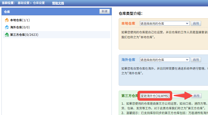 找到第三方仓库,搜索并选择星链海外仓 - 启用