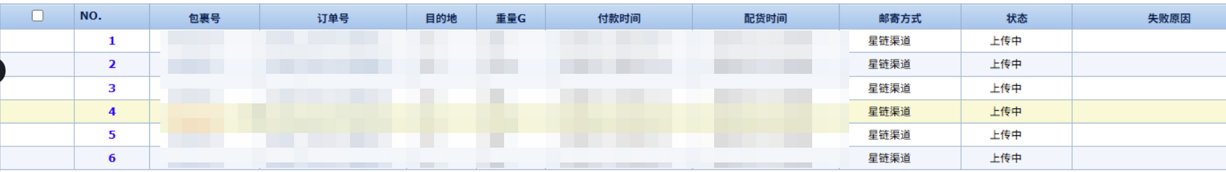 选择星链海外仓,勾选包裹,勾选“上传后立即交运”,单击“批量上传”,将包裹数据上传到领星OMS系统;上传成功后领星OMS会返回跟踪号(运单号)到通途系统。