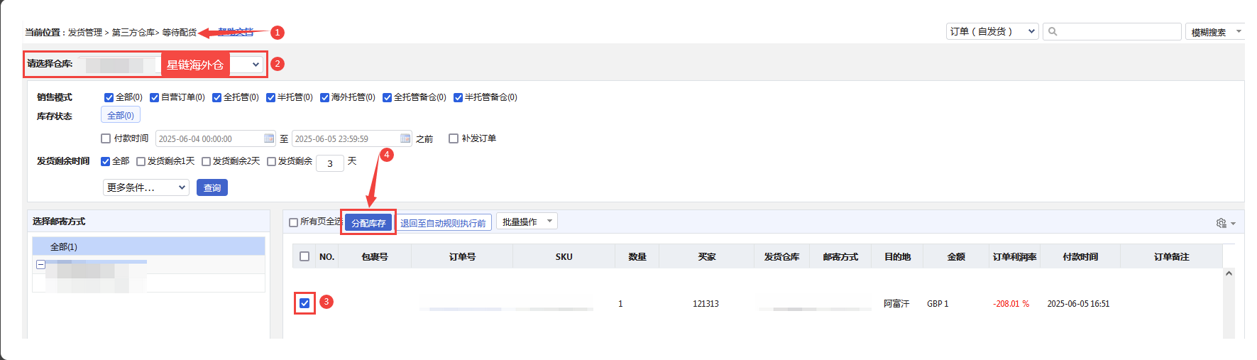 路径:发货管理 - 第三方仓库 - 等待配货 - 选择星链海外仓 - 勾选订单,单击“分配库存”