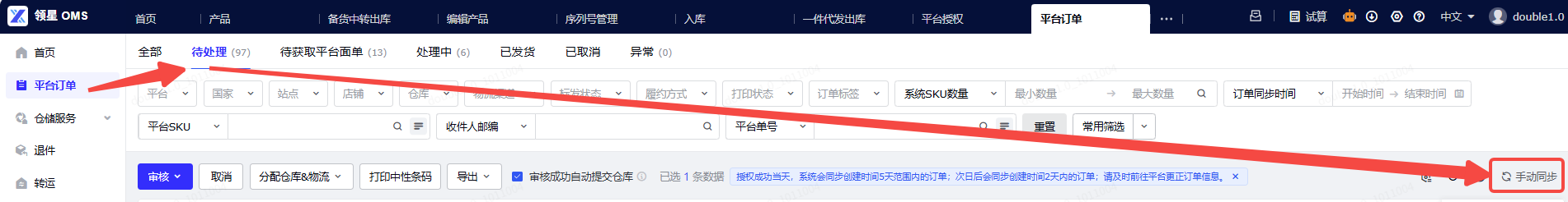 OMS-平台订单,可以使用【平台】筛选tongtool的订单;详细操作可参考:使用OMS平台订单实现发货 | 领星WMS帮助中心-卖家版