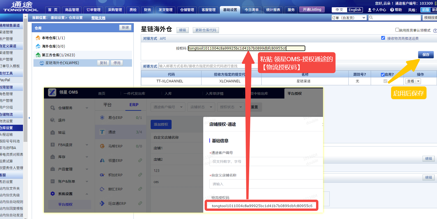 复制领星OMS授权通途时的【物流授权码】,填写在通途ERP页面中 - 勾选启用 - 保存