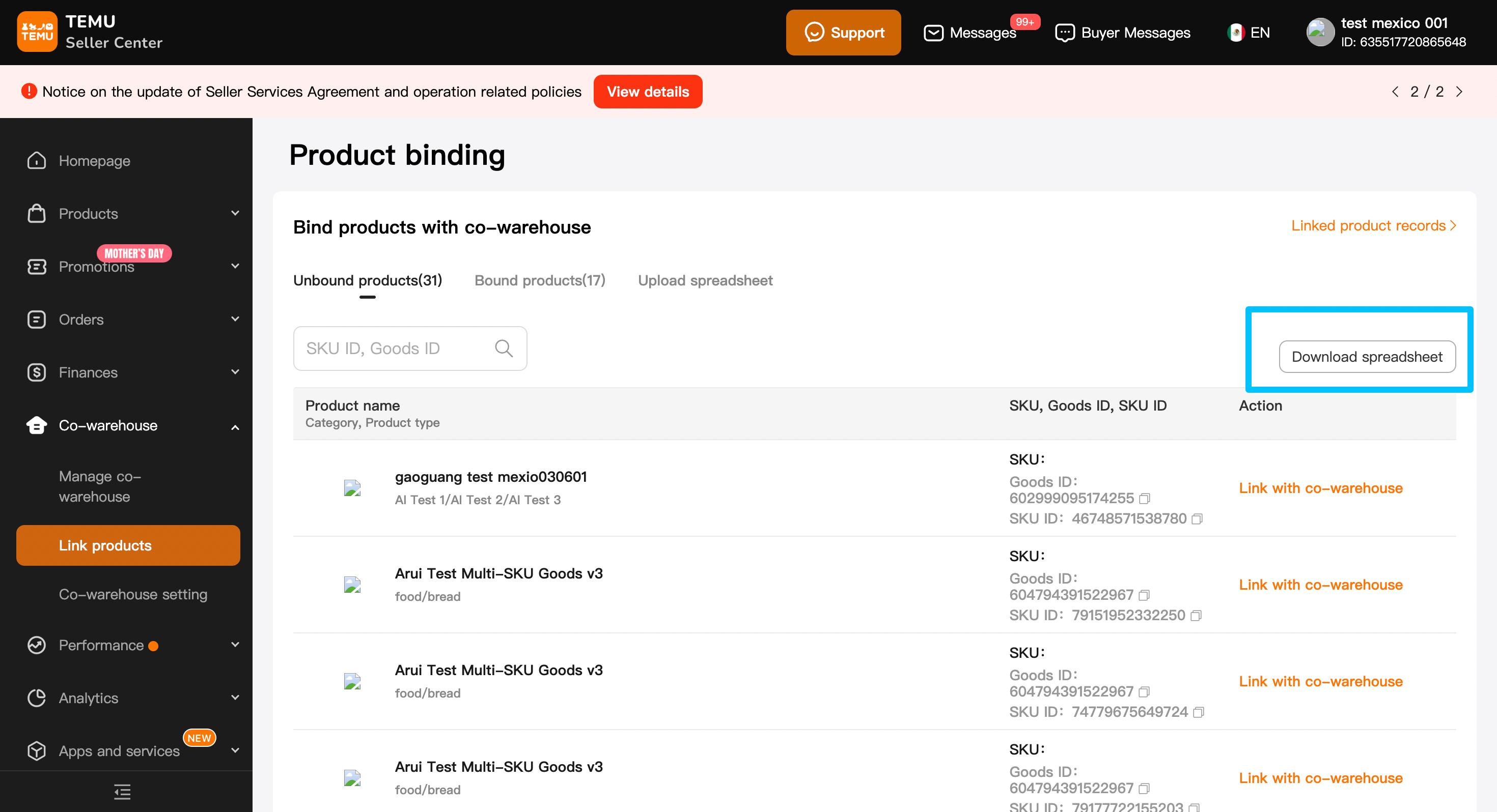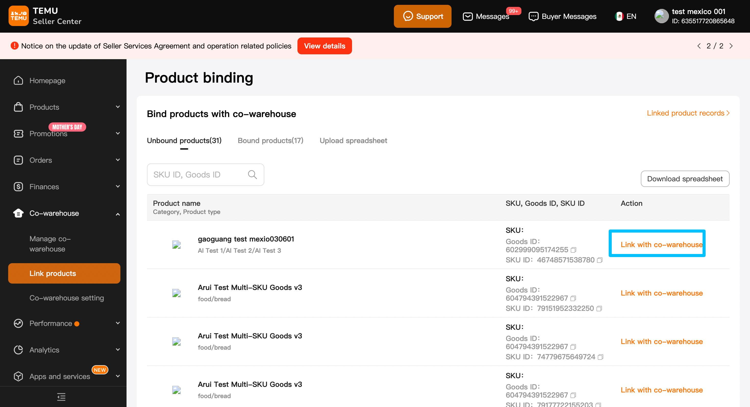 3.1选择要绑定合作对接仓的 SKU,点击“Link with a co-warehouse”