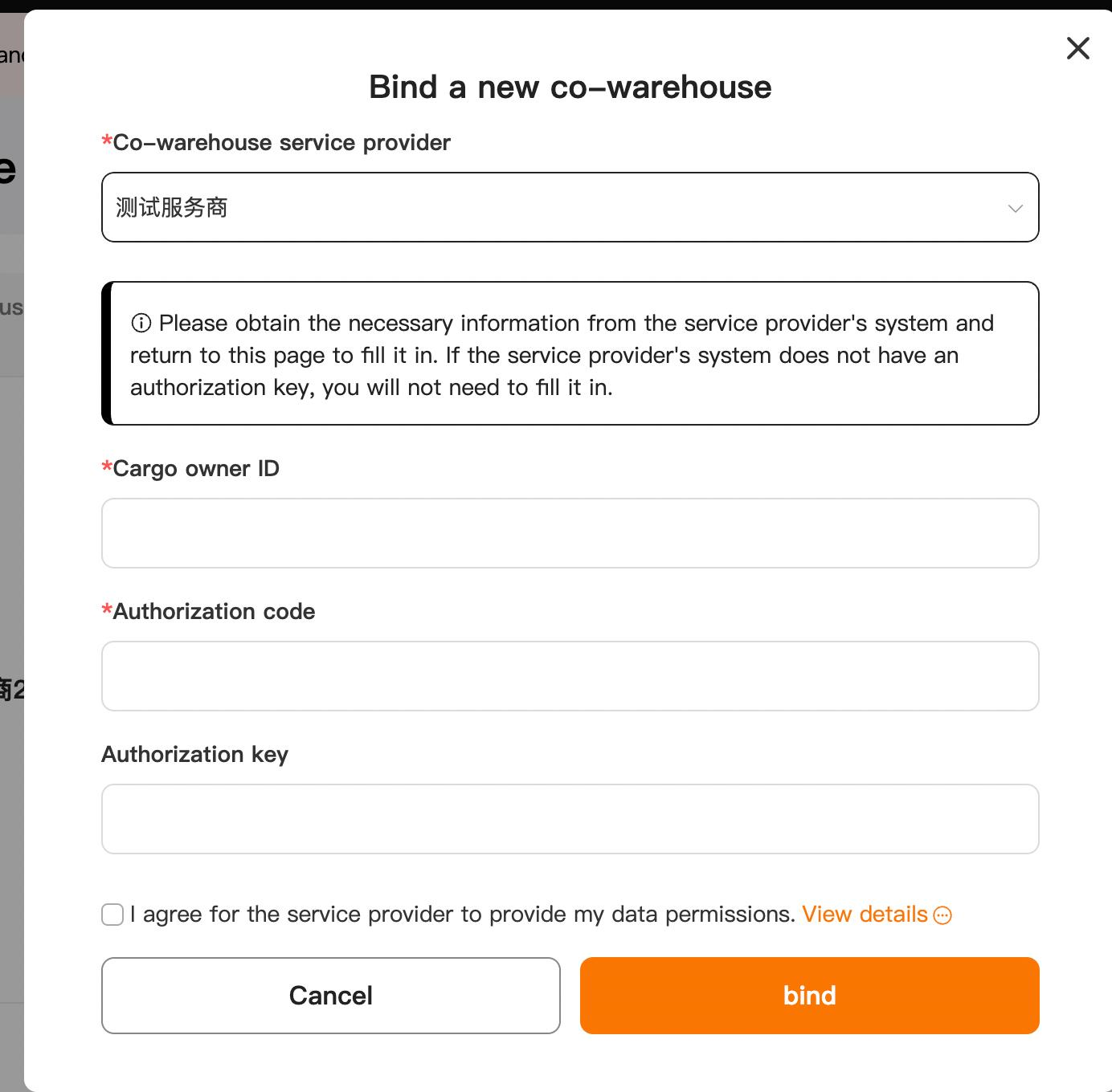 - 在商家后台合作仓页,创建与合作仓的绑定关系