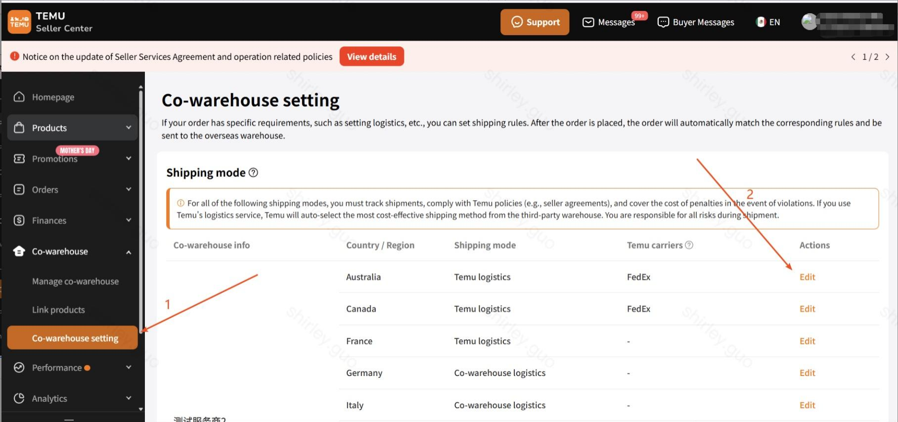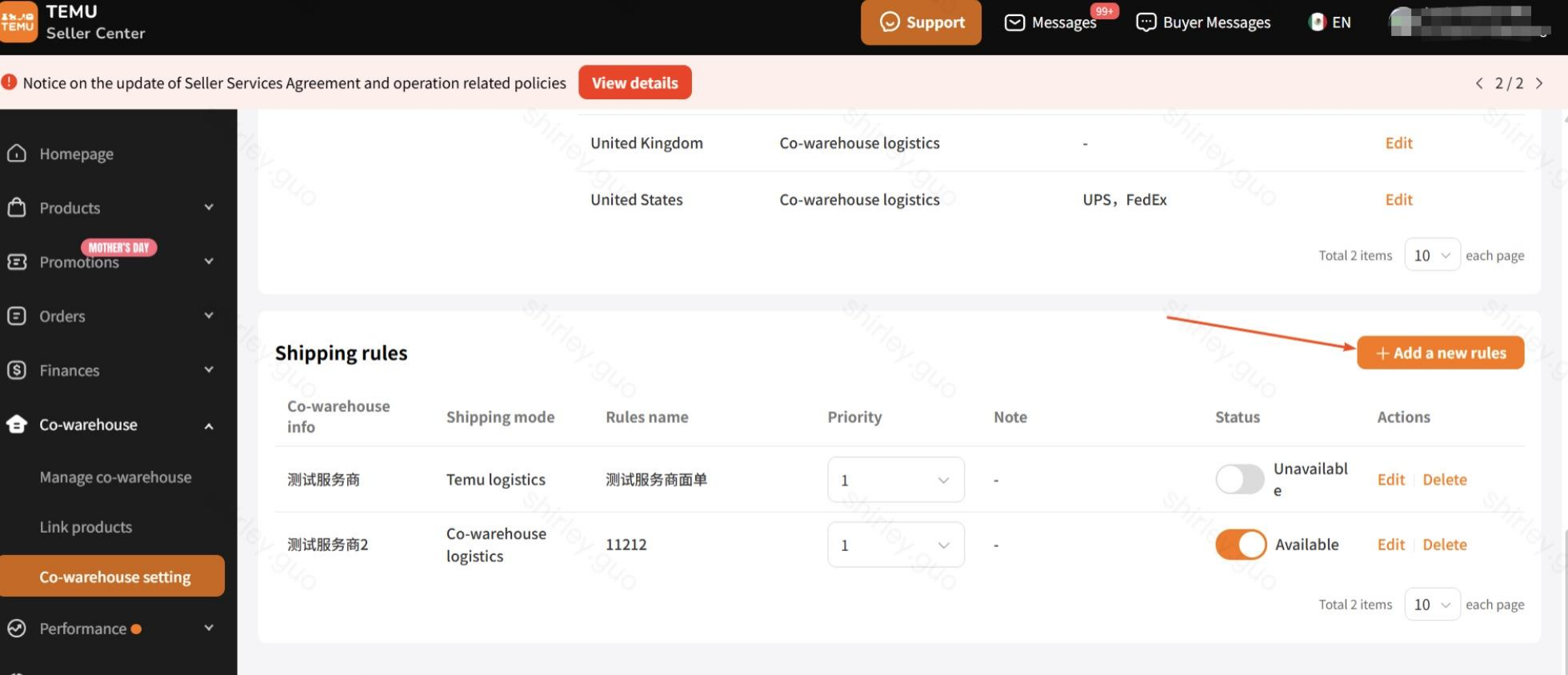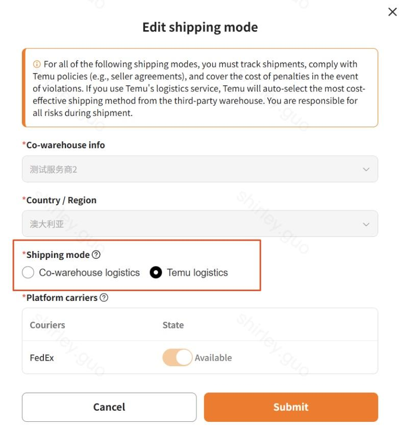 点击编辑按钮,可以指定国家、指定服务商,选择是否使用平台物流