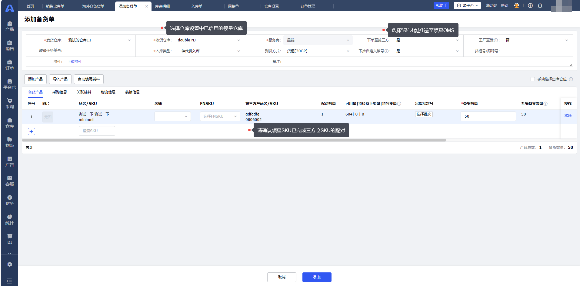 上一步点击添加后,系统会对比发货仓库的可用量及备货量。