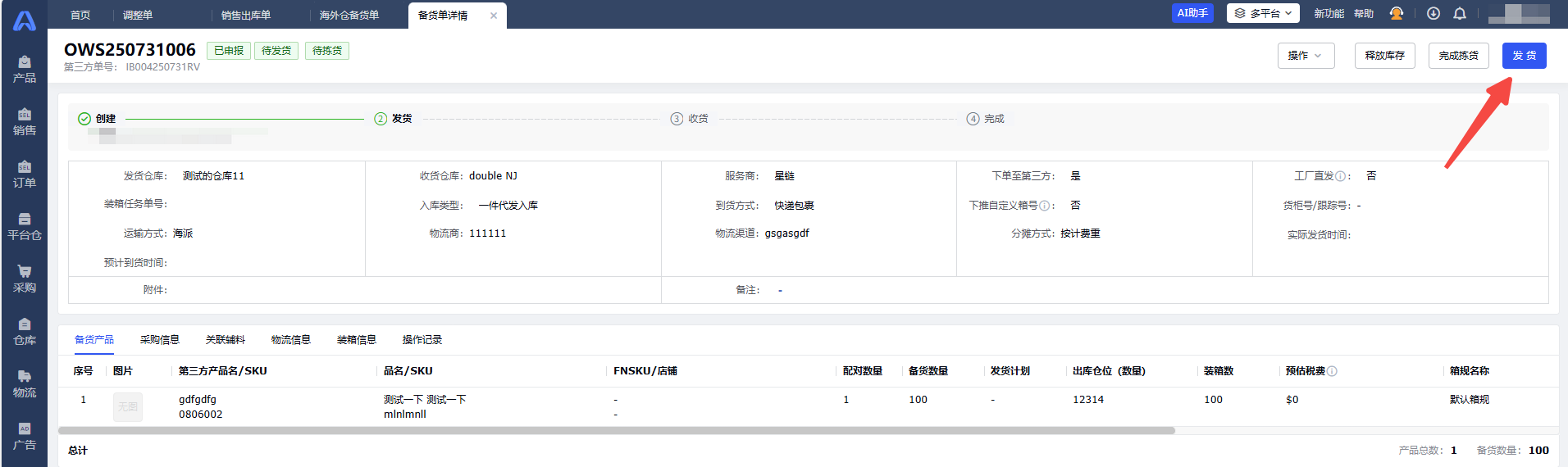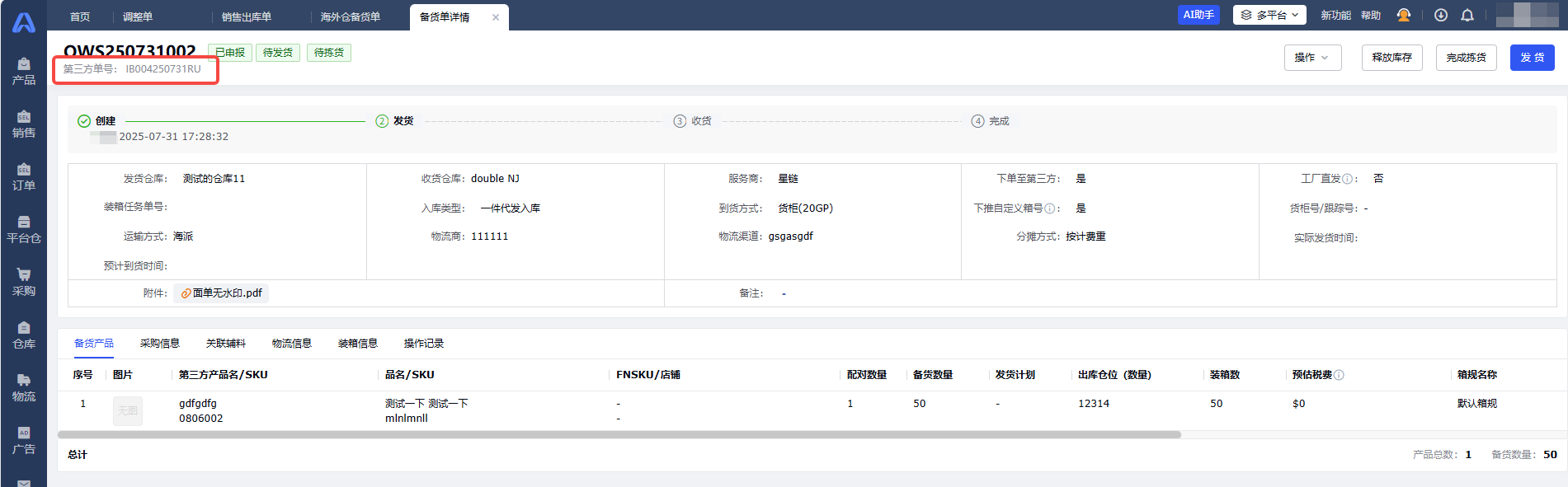 需对备货单进行申报(申报后,领星ERP把备货单传到领星OMS - 入库界面),申报后才可点击发货。点击申报后,左上角的第三方单号,会显示领星OMS的入库单号。