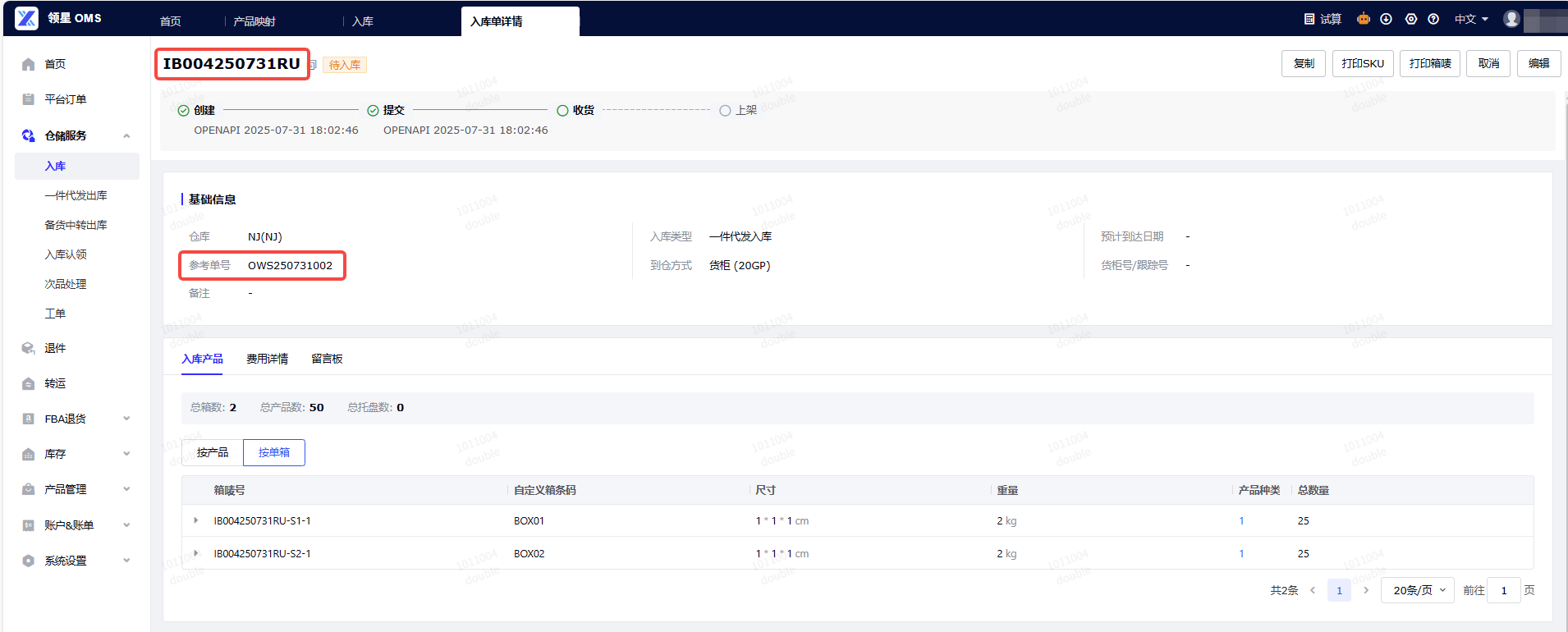 客户可以登录领星OMS - 仓储服务 - 入库 - 待入库,搜索对应的入库单号(对应领星ERP界面的第三方单号)/参考单号(对应领星ERP的系统单号)进行查看。