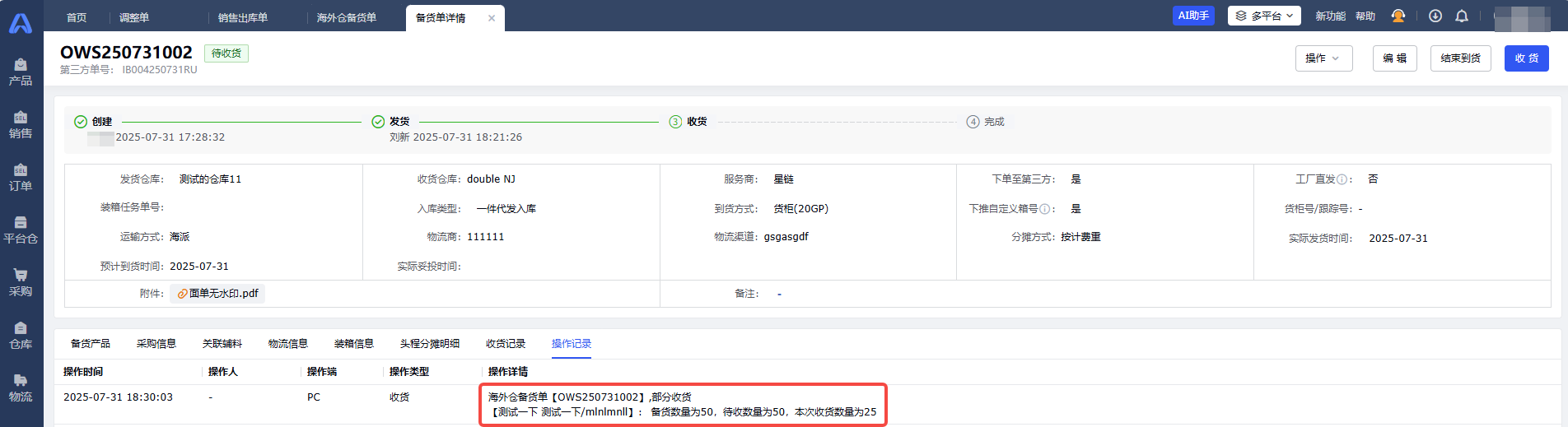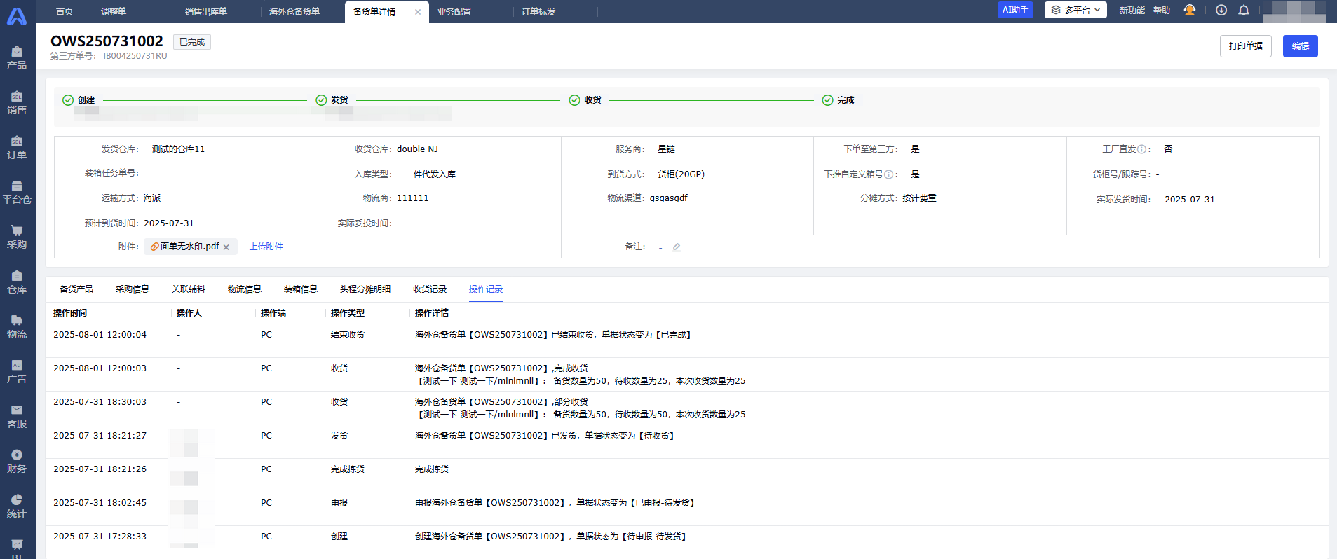 当仓库完成单据内所有产品的收货上架后,海外仓备货单会自动更新为【已完成】状态。