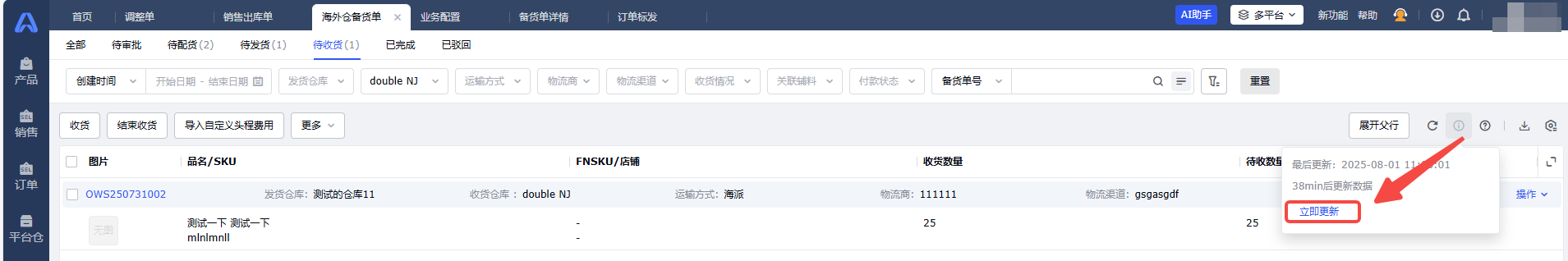 可以在海外仓备货单 - 待收货界面,手动点击“立即更新”,即时同步收货情况。