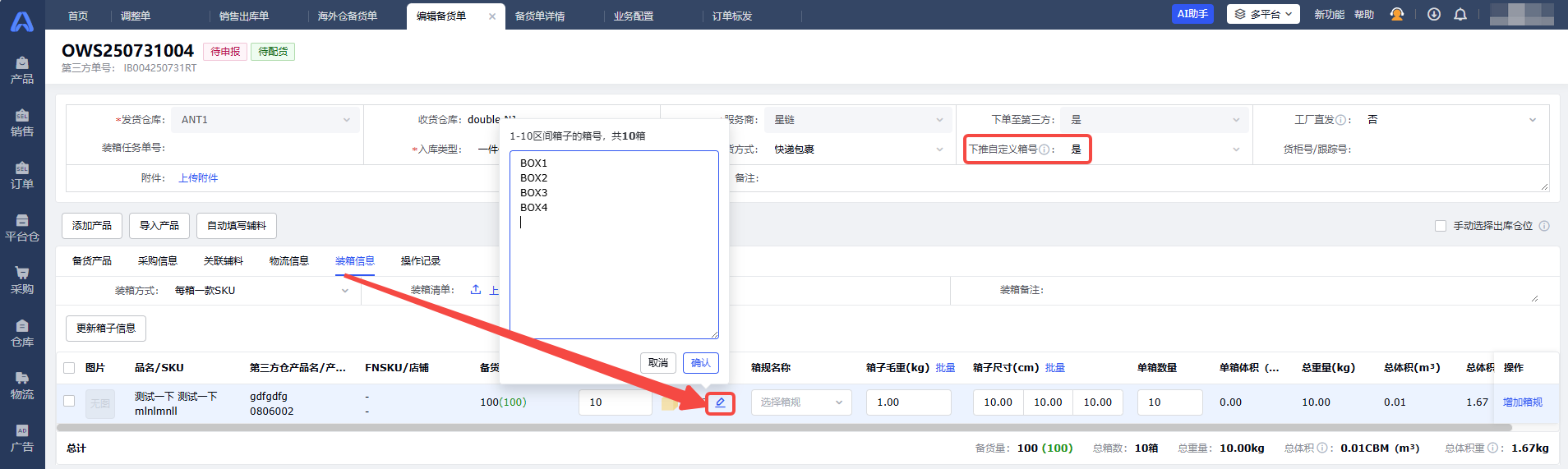 A2:如需推送自定义箱条码至领星OMS,请先勾选“下推自定义箱号“。装箱信息界面,点击编辑标识,在输入框内按顺序分行填写每箱对应的自定义箱条码。