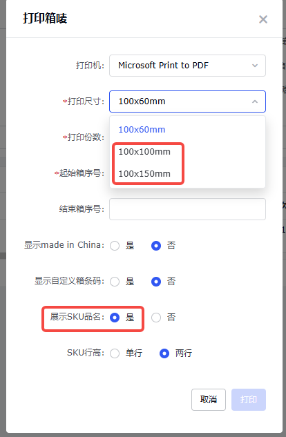 A3:当备货单更新为“待收货”状态时,可点击操作 - 打印箱唛,会自动同步领星OMS生成的箱唛并进行打印。请先按照提示下载安装打印控件。如果您需要在箱唛上展示箱内产品信息,打印尺寸请选择100×100mm,或是100×150mm。