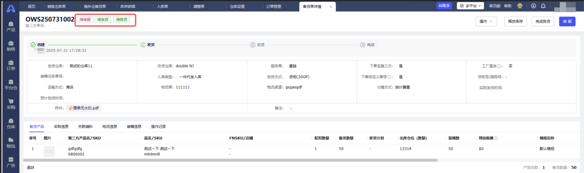 ● 当可用量大于备货量时,单据状态会更新为”待申报“-”待发货“-”待拣货“状态。