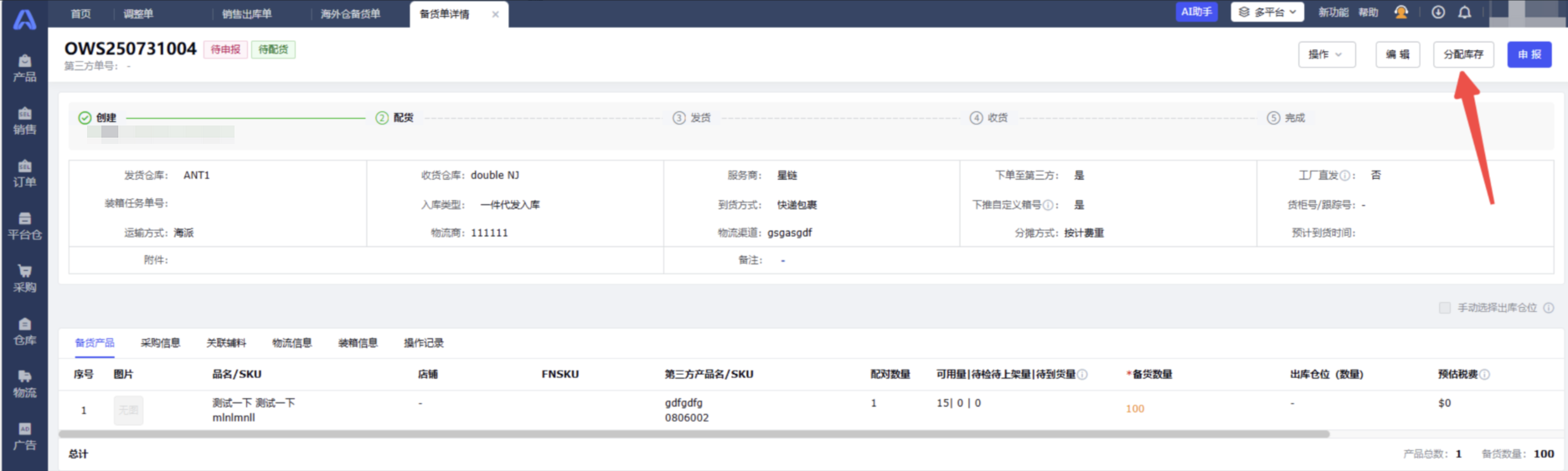 ● 当可用量小于备货量时,单据状态会更新为”待申报“-”待配货“,需要操作”分配库存“。