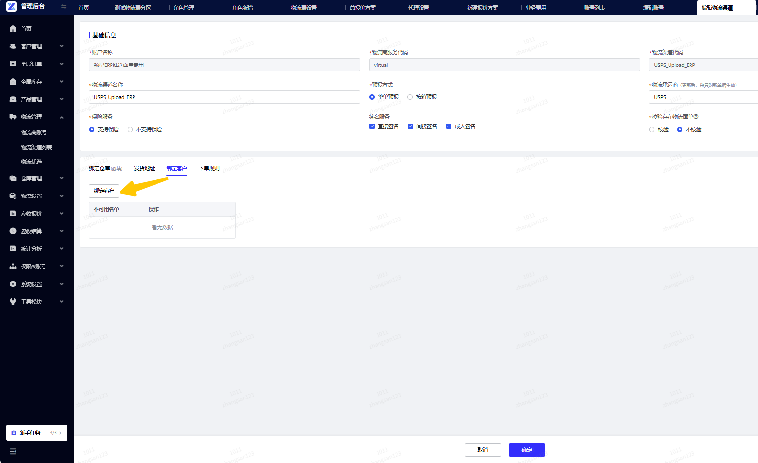 渠道默认对已绑定该仓库的全部客户开放。如需指定个别客户使用,可继续操作绑定客户(非必选项)