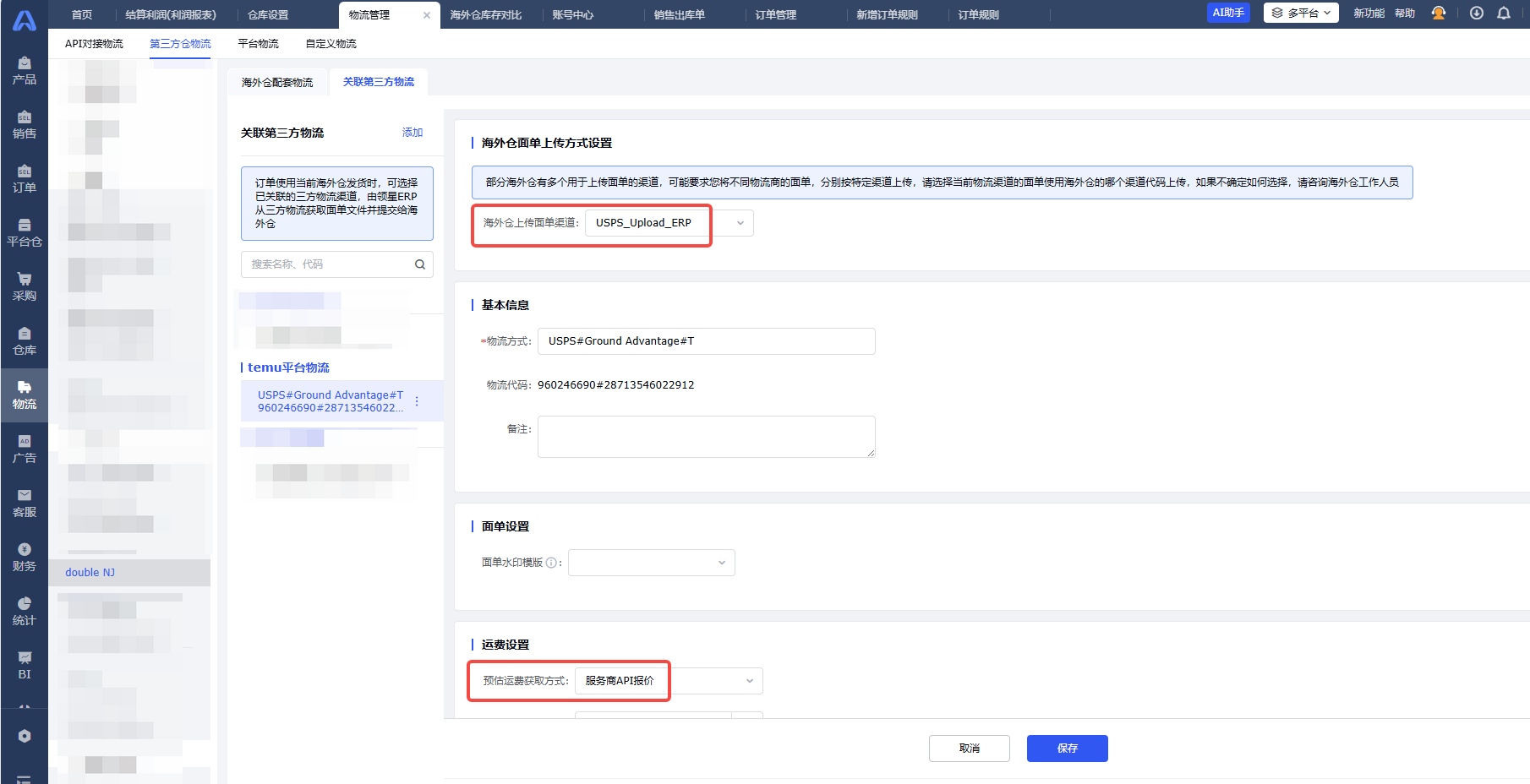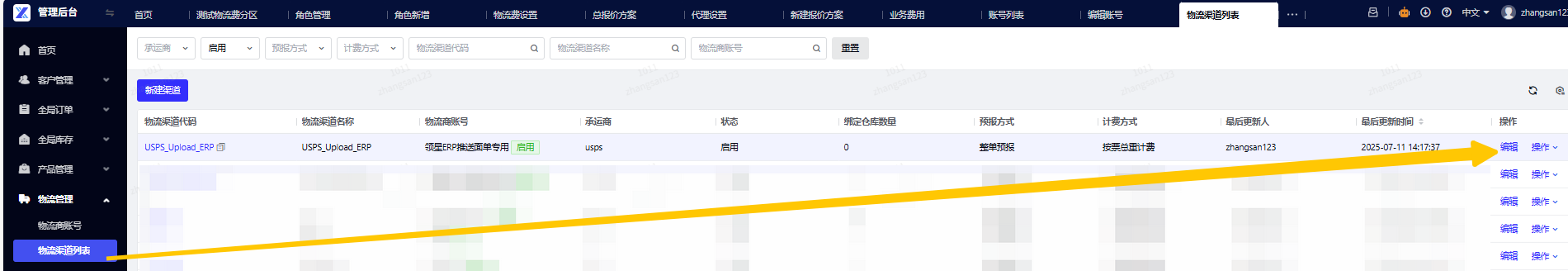 路径:OMP - 物流渠道列表 - 编辑,选择上一步已创建的自定义物流商渠道