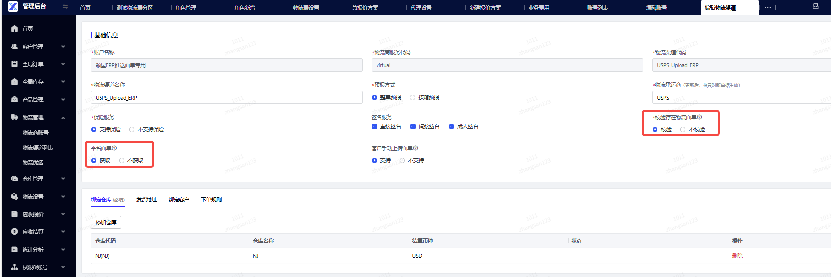 绑定仓库,勾选可使用这个渠道的仓库(必选项)
