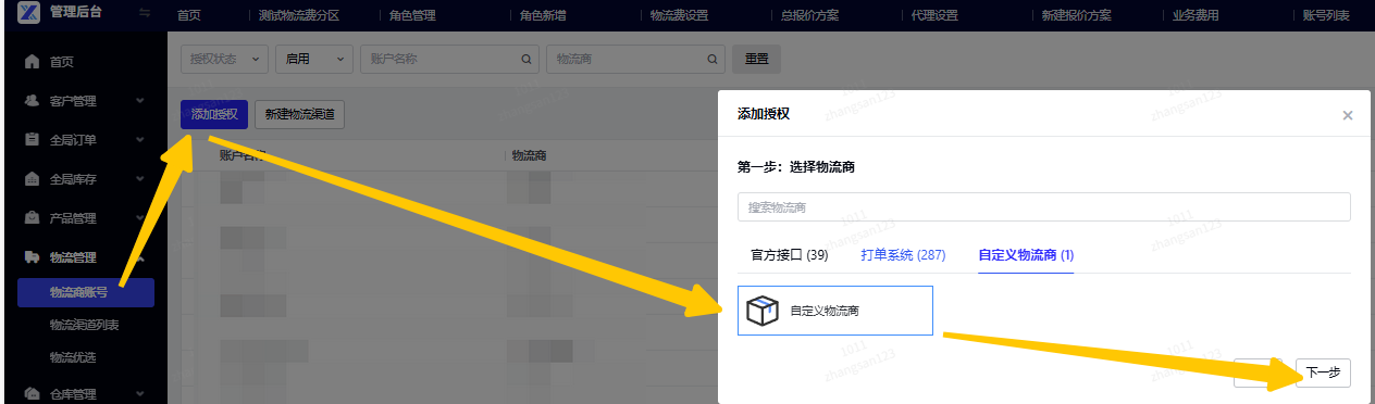 路径:领星OMP - 物流管理 - 物流商账号 - 添加授权 - 自定义物流商 - 下一步