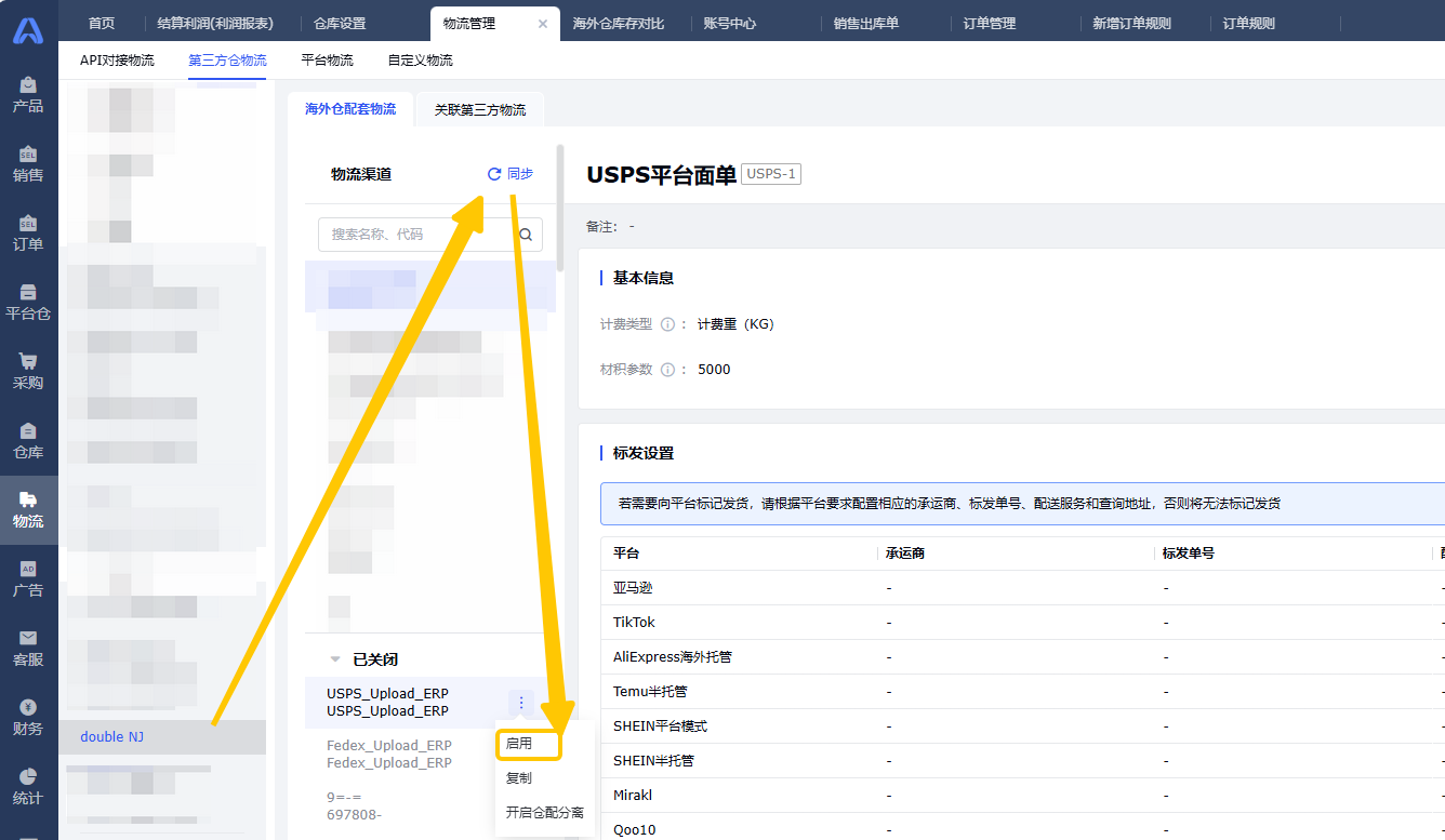 路径:物流 - 物流管理 - 第三方物流 - 海外仓配套物流,先点击“同步”,在已关闭列表中启用新的渠道。(※渠道名称与渠道代码,请先与您的仓库进行确认。本篇文档仅提供示例,可能与您仓库实际创建的不一样)
