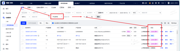 2.在【仓储服务】-【一件代发出库】搜索平台单号确认订单状态。