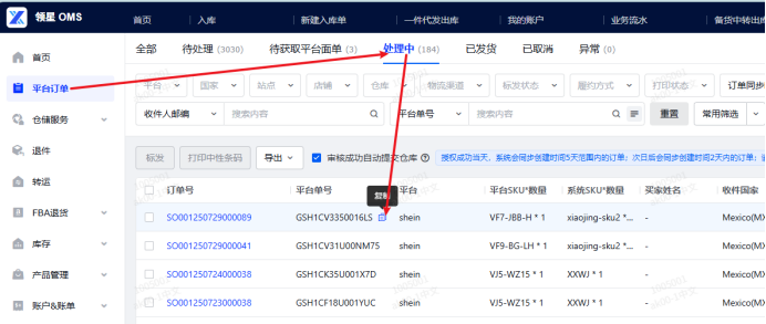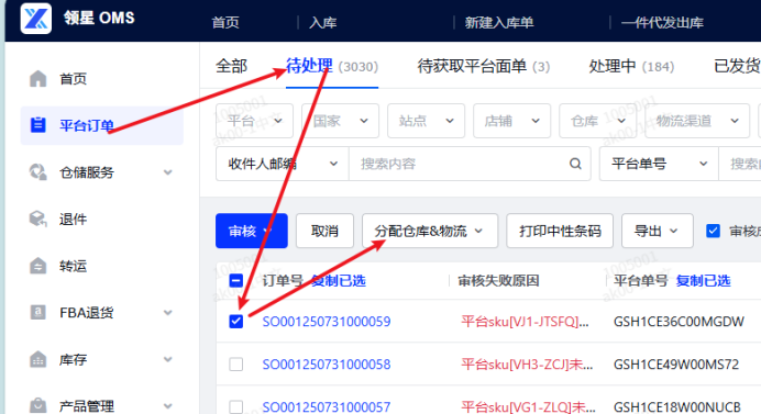5.【待处理】状态勾选订单重新分配仓库和物流