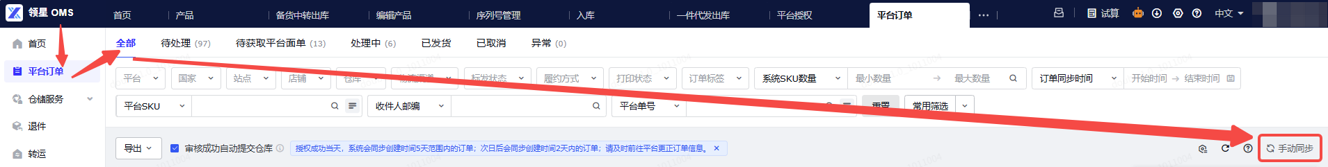 确认仓库ID一致,或者选择的是同步所有订单,但是平台订单还是没有同步到OMS的话,往下进行第三步的确认