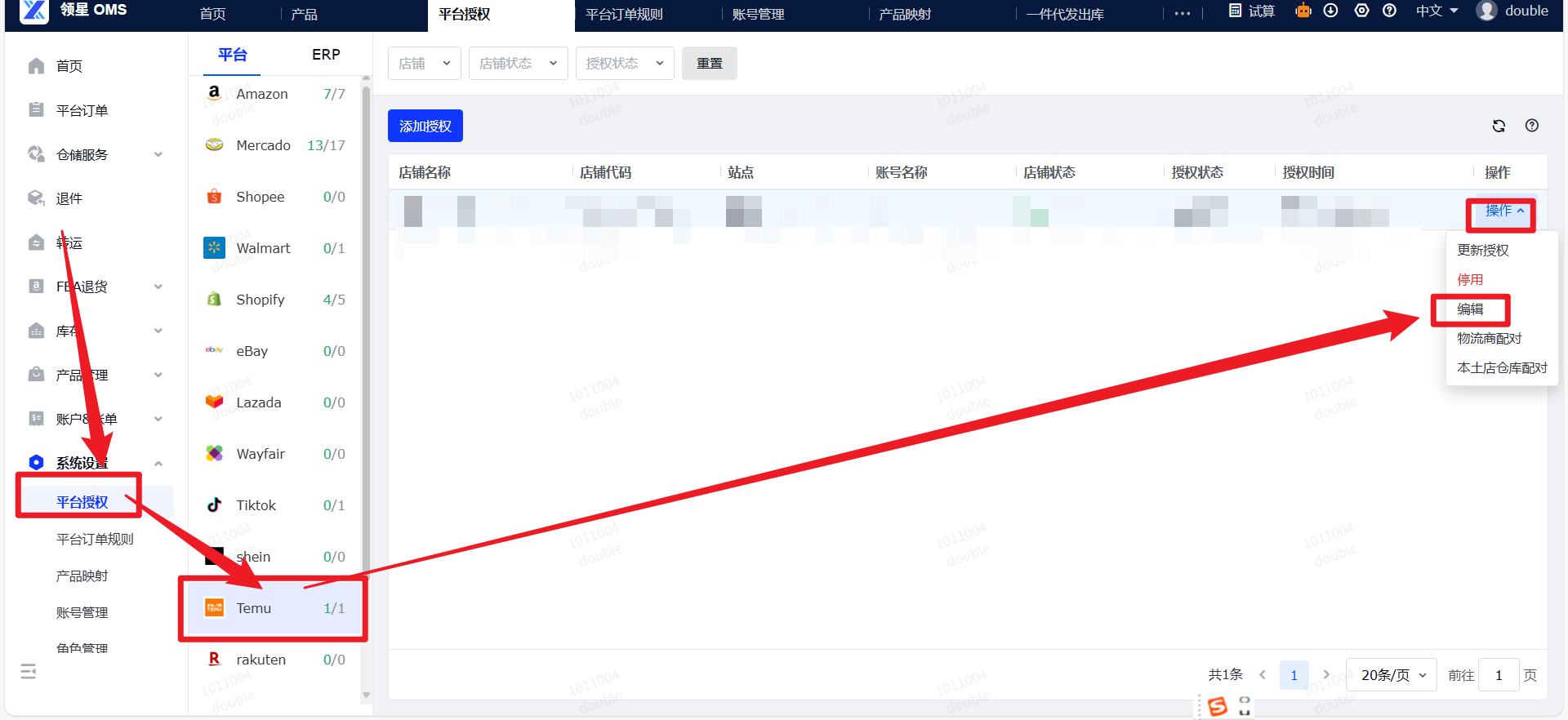 路径:领星OMS - 系统设置 - 平台授权 - Temu - 操作 - 编辑