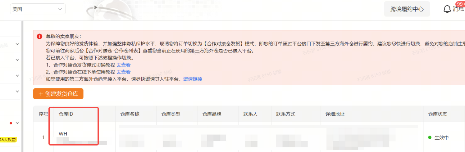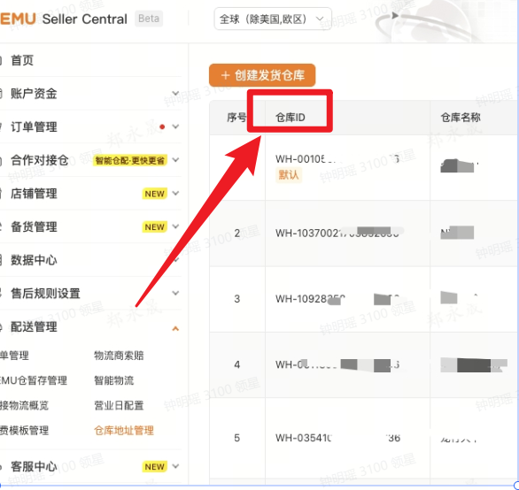 在卖家中心首页点击【配送管理】-【仓库地址管理】,请注意在跳转时,根据【覆盖站点】选择前往美区/欧区/全球站点界面,根据仓库名称查询对应的仓库ID