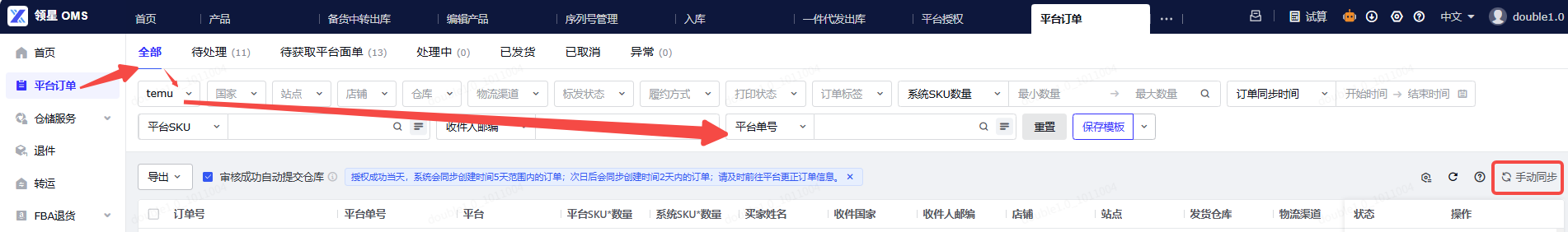 目前仅同步TEMU待发货状态下的订单,已发货状态不同步。领星OMS系统每15分钟同步次店铺内满足状态的订单,如果需要立即同步,可以点击领星OMS - 平台订单 - 手动同步。
