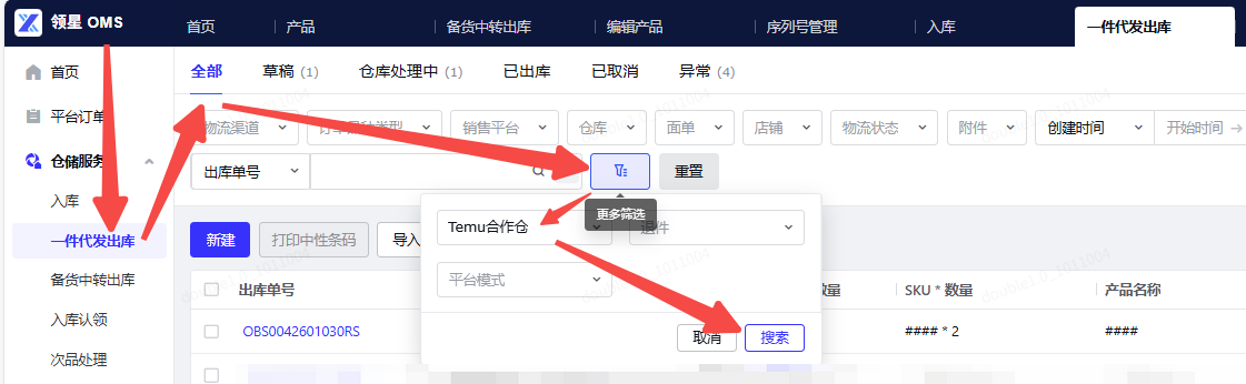 【合作对接仓履约订单】:将订单推送至对接服务商的OMS账号,直接创建为“一件代发出库单”,不会经过领星OMS的平台订单模块。可以在领星OMS - 仓储服务 - 一件代发出库界面按“参考单号”搜索“批次订单号”,或是按“平台单号”搜索“平台单号”详细操作说明可参考:仓库完成TEMU认证仓对接之后,客户如何切换为合作仓模式发货 | 领星WMS帮助中心-卖家版