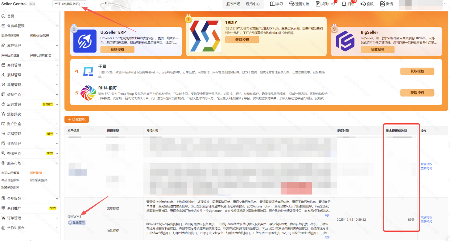 登录店铺后台 - 服务市场 - 授权管理界面可查看已授权的领星WMS应用的“剩余授权有效期”,TEMU应用授权正常仅有90天的有效期,如果无剩余有效期,领星WMS应用的“剩余授权有效期”将为空,需要操作【重新授权】。