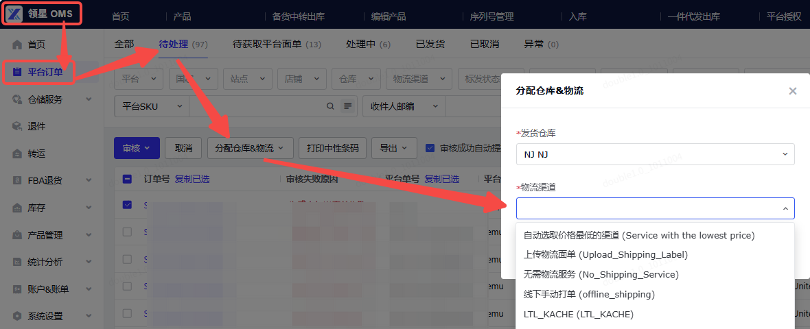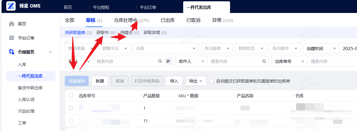 分配仓库渠道的订单,审核成功后会进入【处理中】状态,可进入仓储服务 - 一件代发出库,确认第三方物流面单的获取情况。详细操作可参考:使用OMS平台订单实现发货 | 领星WMS帮助中心-卖家版