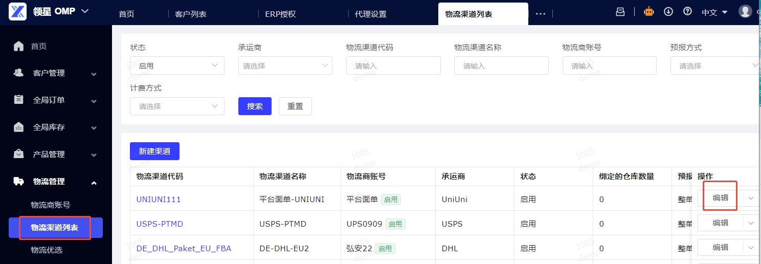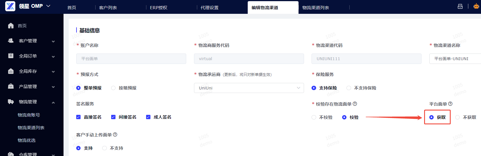 第一步:联系海外仓在OMP(管理后台)-物流渠道列表,找到订单所用的渠道-编辑;勾选上【获取】平台面单。