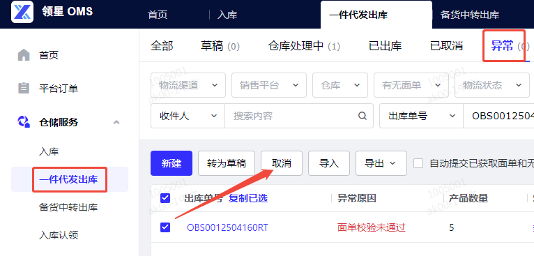 第二步:OMS-【一件代发出库】-异常,取消这单。