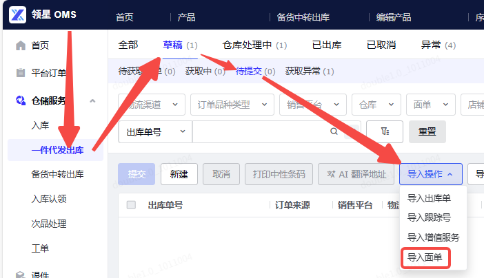 第二步:在OMS - 【一件代发出库】 - 草稿 - 待提交 - 导入操作 - 导入面单,批量上传面单。详细操作说明可参考:使用OMS批量导入拆分面单 | 领星WMS帮助中心-卖家版