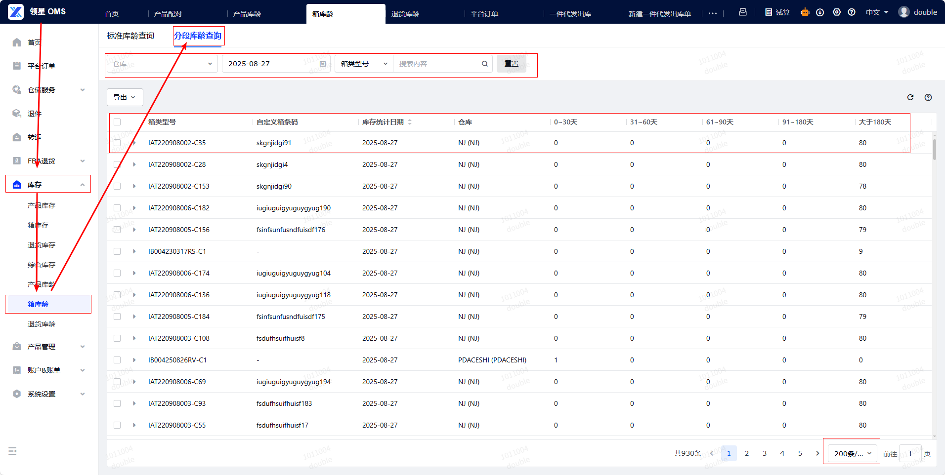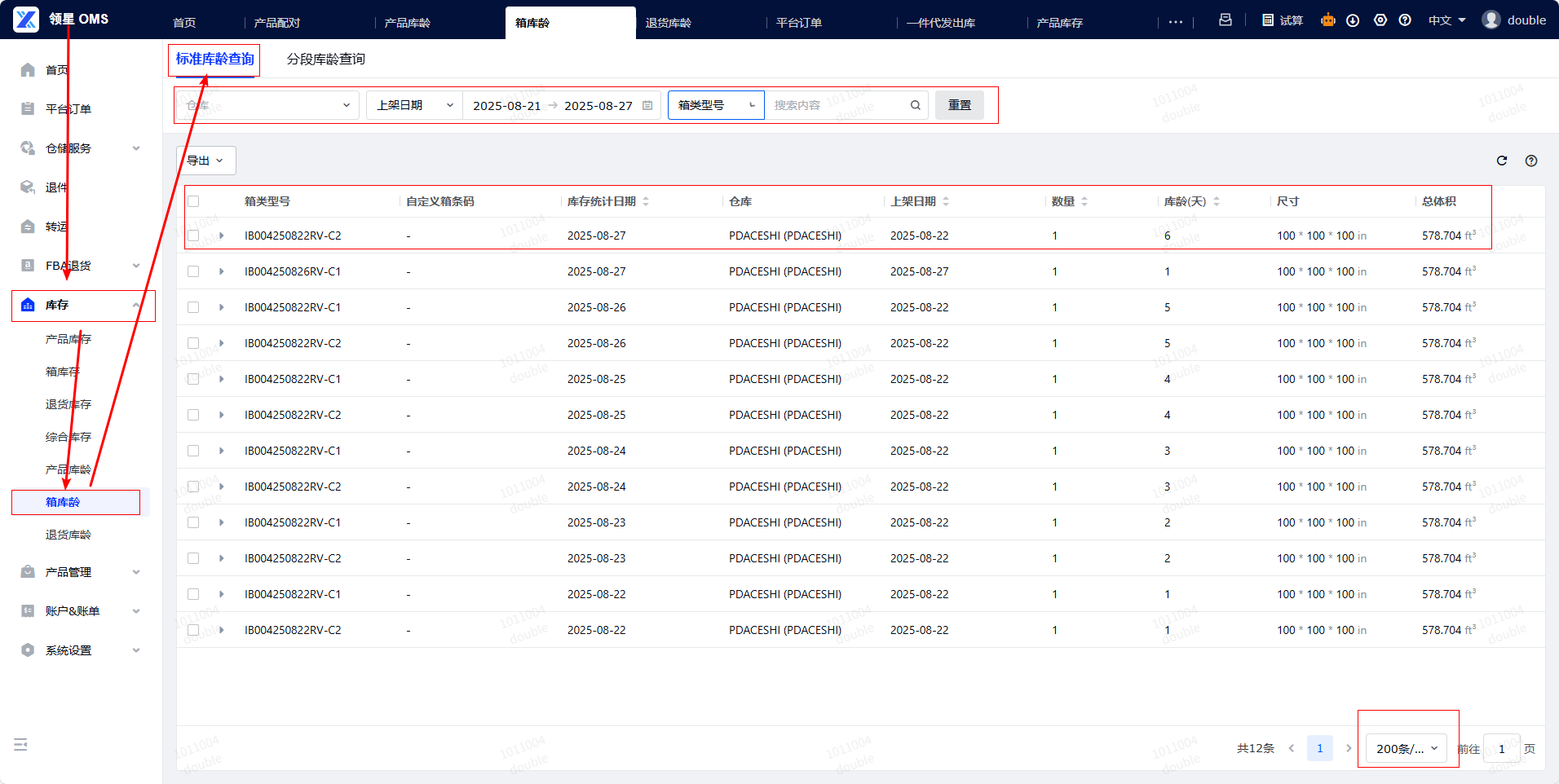 ● 支持按仓库、库存统计日期/上架日期、箱类型号/自定义箱条码/SKU搜索对应库龄,单页最大显示量为200条/页,若想查看最新的库龄情况,可以在北京时间16:00后【库存统计日期】按前一日的日期筛选(系统默认北京时间16:00统计前一天的库存情况)。