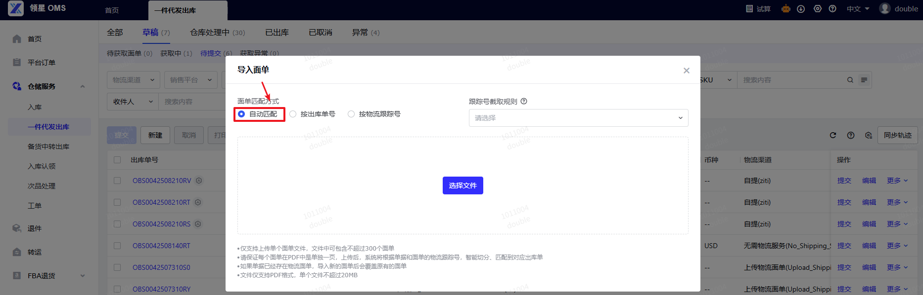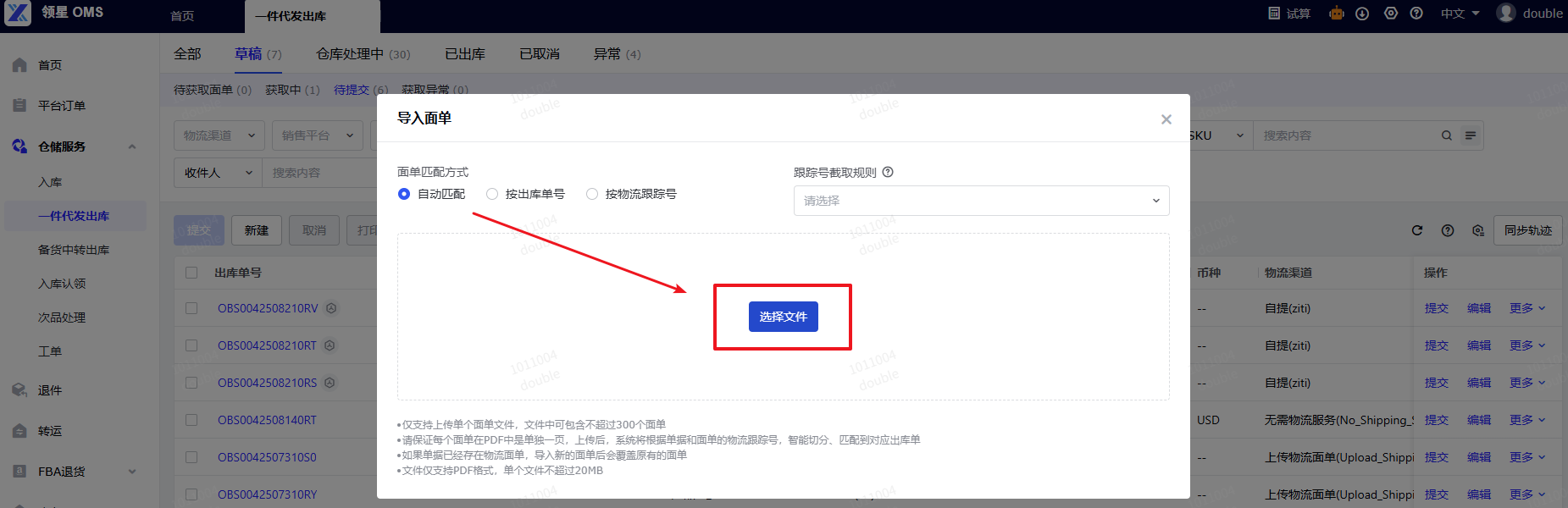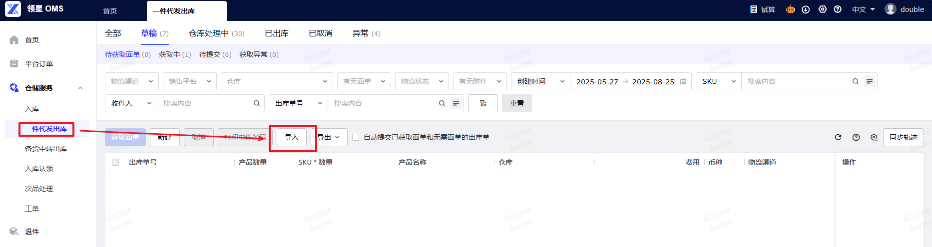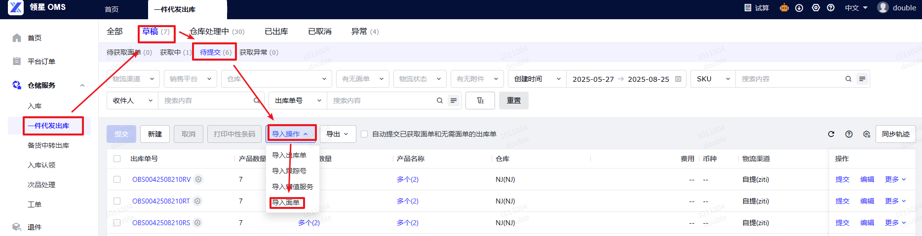 (1)操作路径:OMS -仓储服务- 一件代发出库 - 草稿/待提交 - 导入操作-导入面单