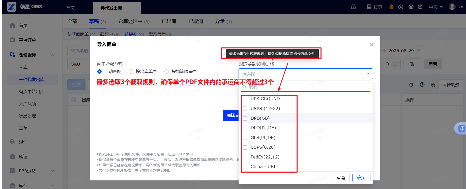 (2)选择自动匹配:如导入的面单是FedEx/UPS等需要应用截取规则的物流商,需勾选【跟踪号截取规则】后,系统才能识别到对应条码