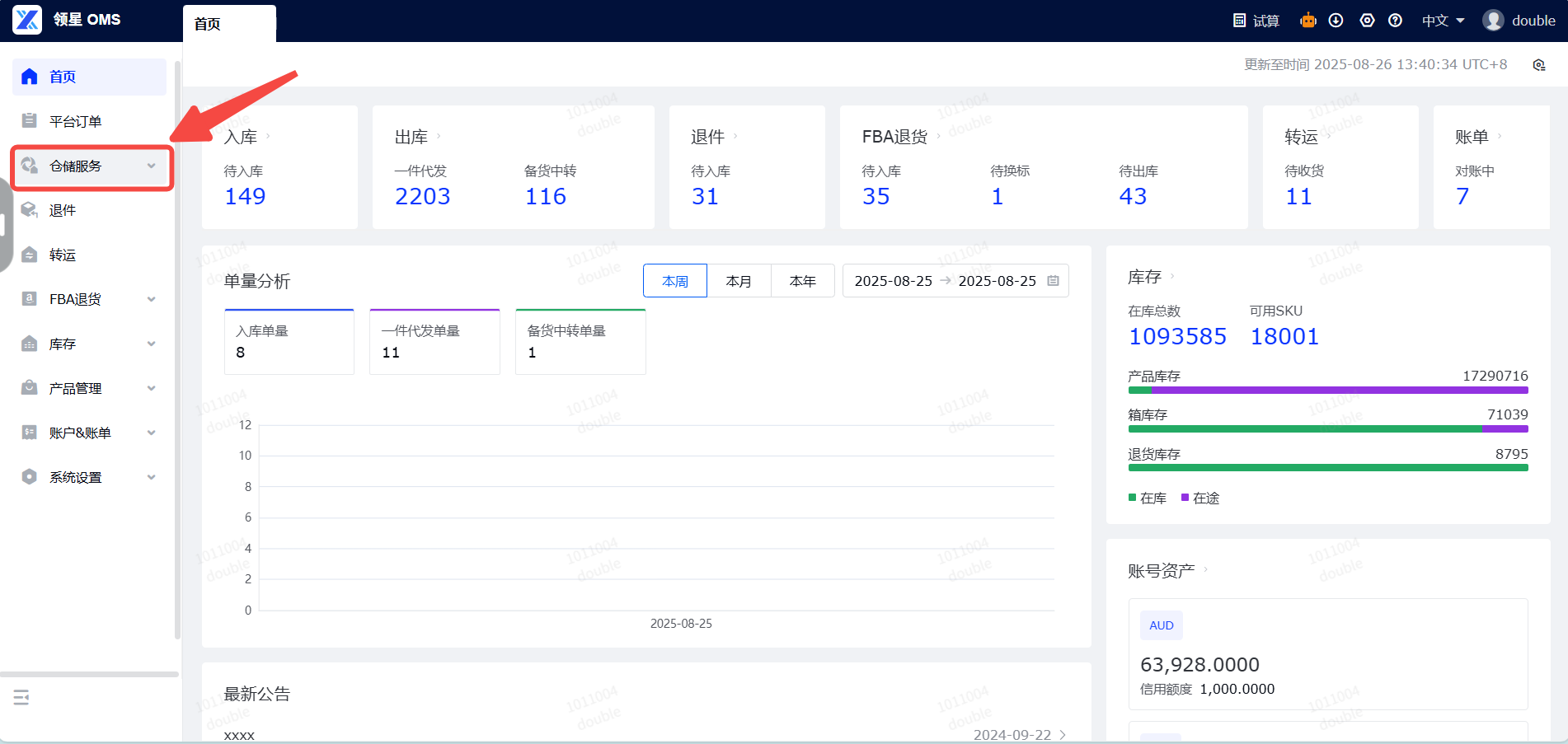 (1)进入OMS系统:登录您的OMS管理后台,导航至仓储服务菜单。