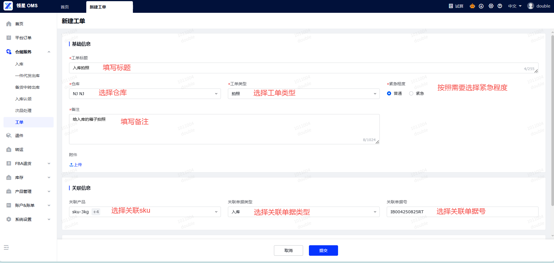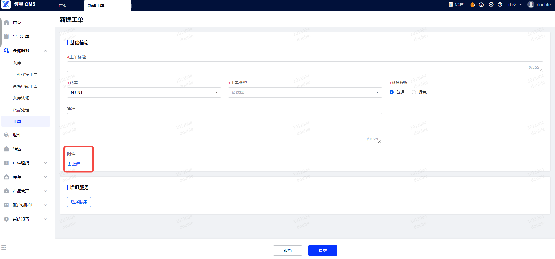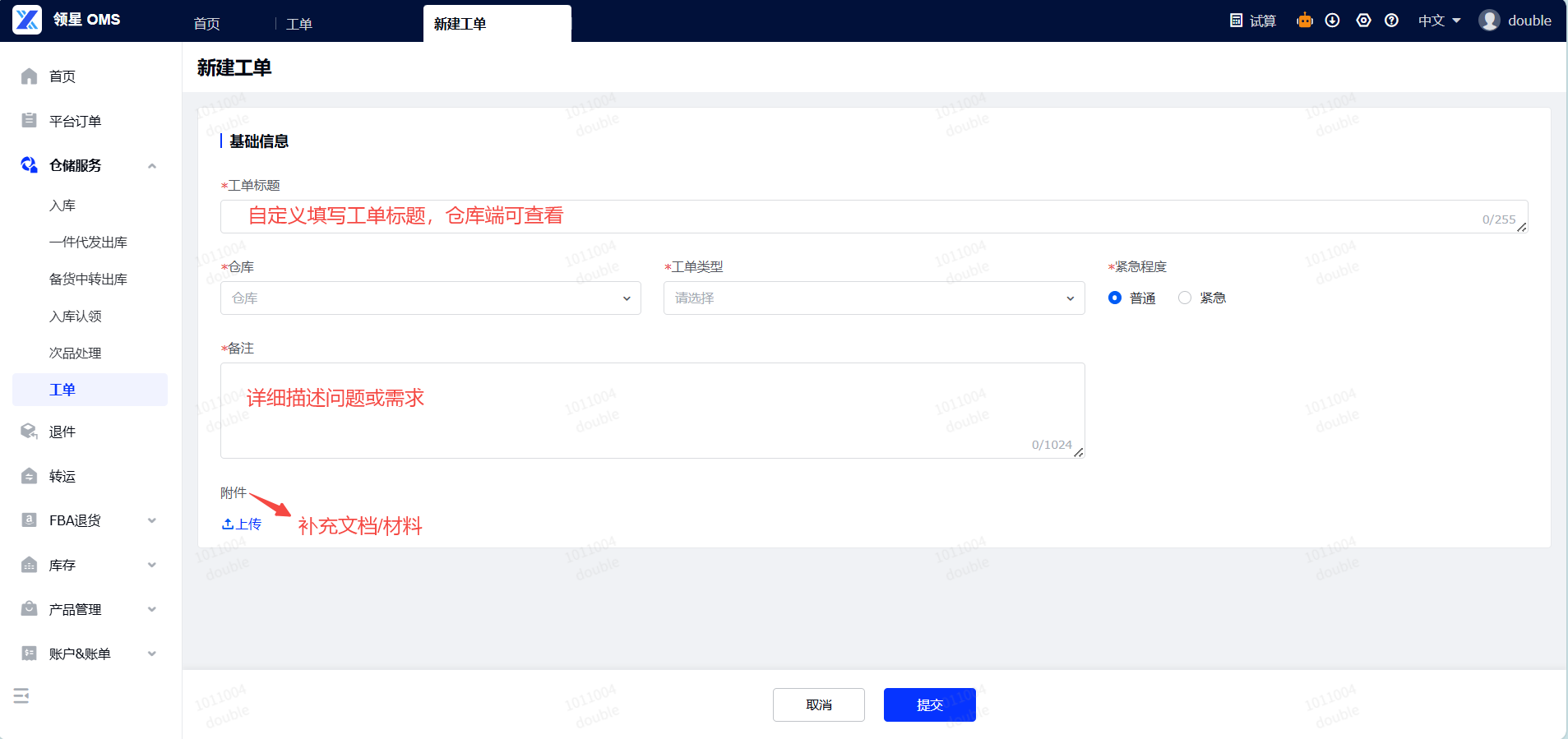 工单类型:工单类型因后续需由仓库执行处理,故其管理权限归仓库人员所有,暂不支持您自行新增;若您有新增工单类型的需求(如适配特殊业务场景),可联系您的海外仓客服协调处理,以下将以几个常见工单类型为例,为您演示工单的具体创建操作。