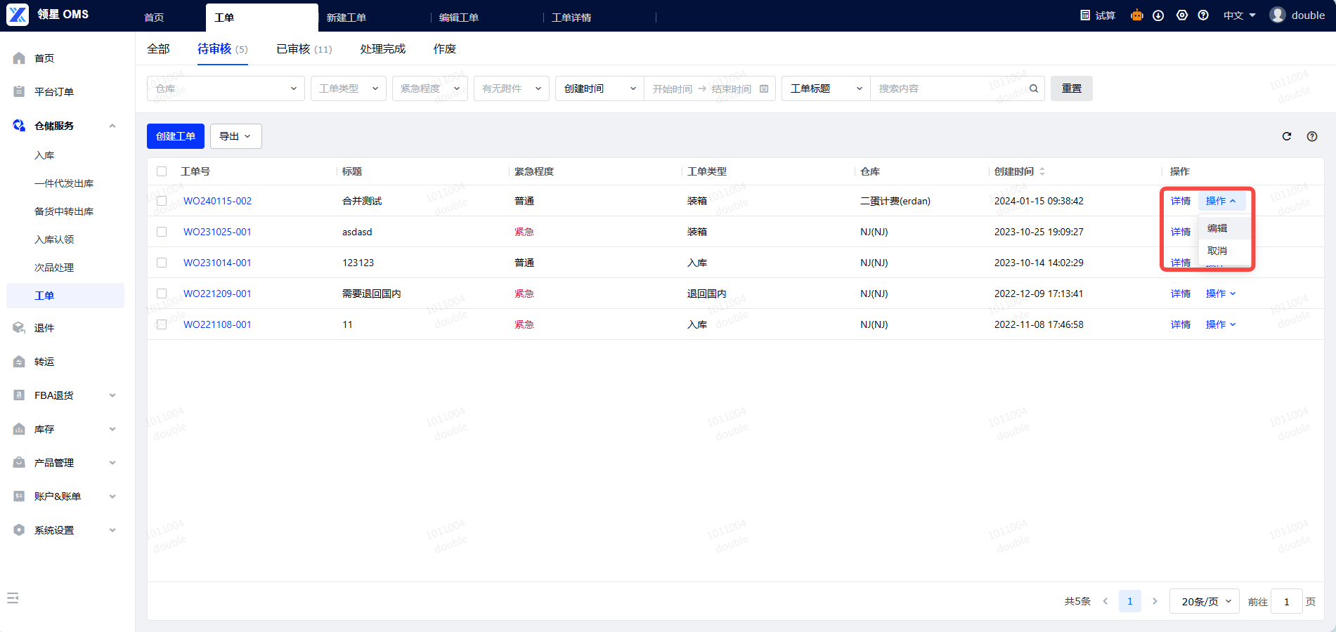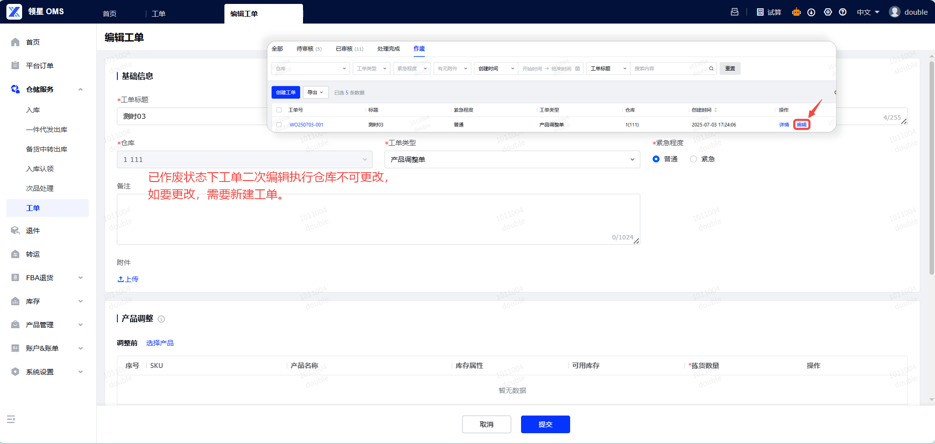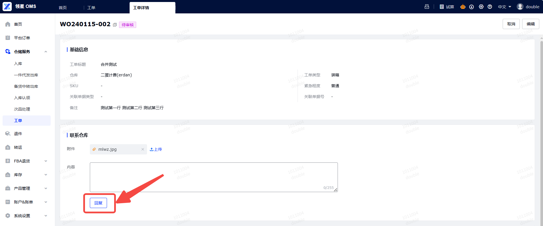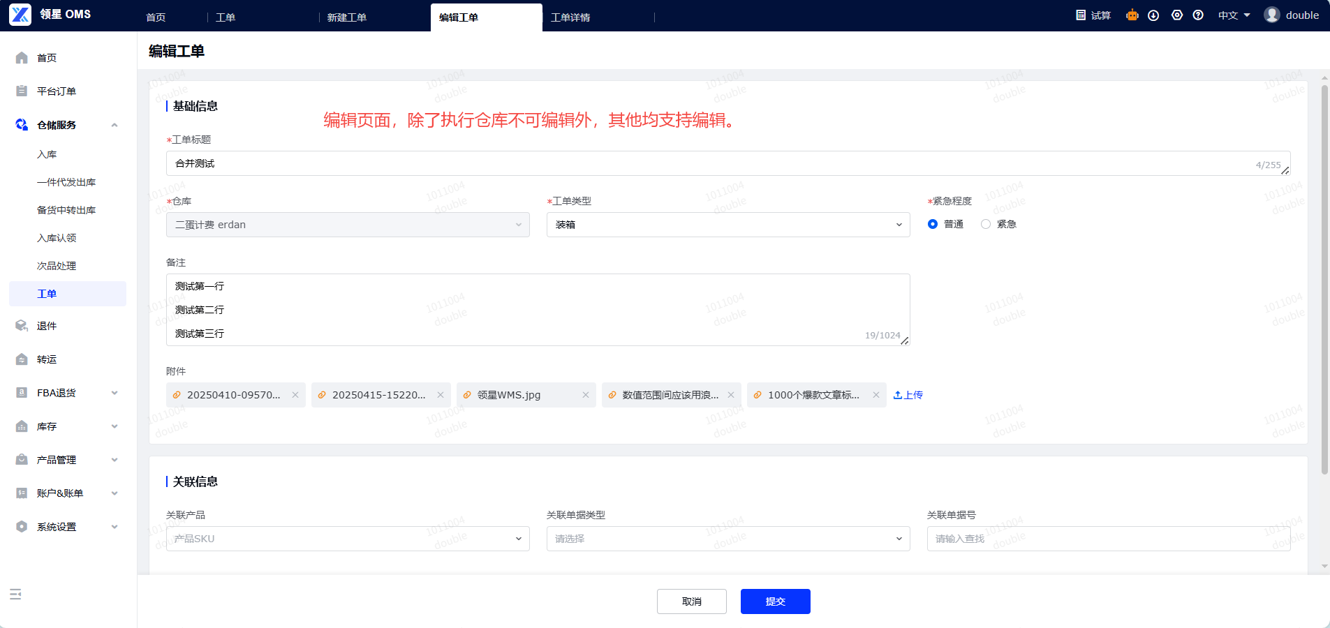 答案:工单在待审核、已审核状态支持在联系仓库处上传附件和内容,处理完成状态不支持,作废状态可二次编辑除执行仓库外的信息。
