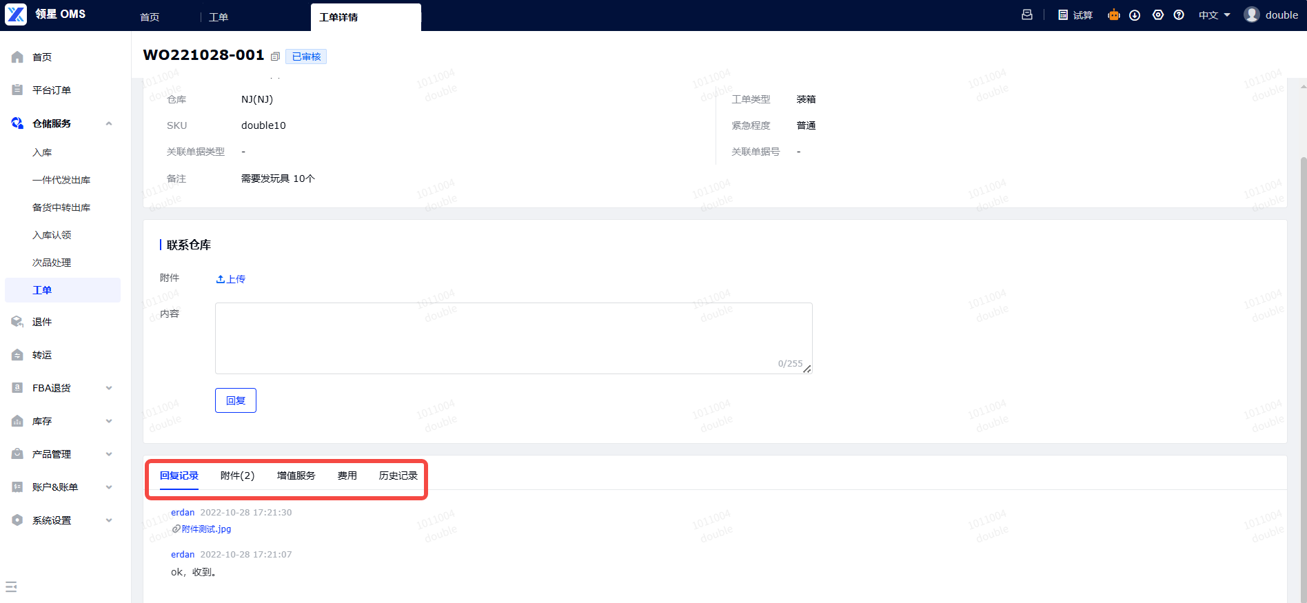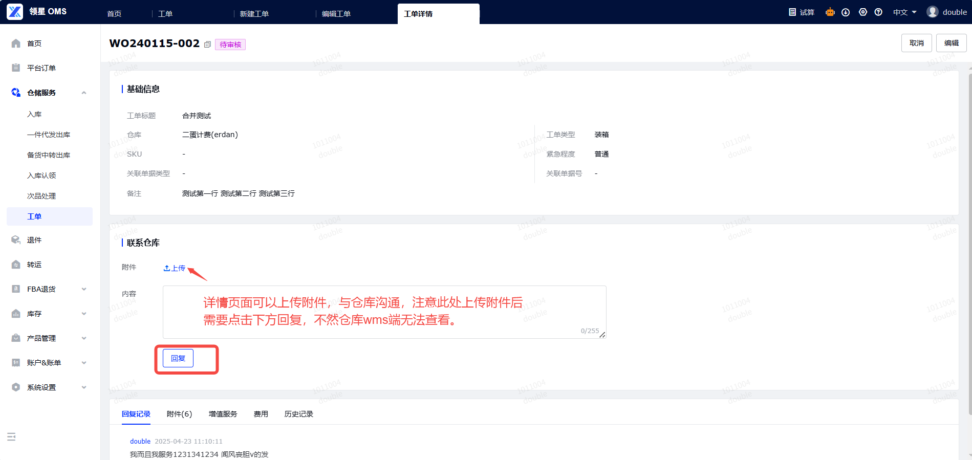 (10)查看仓库反馈&回复沟通:点击工单进入详情页后,在页面下方可查看仓库回复记录、附件、您选择的增值服务、相关费用及历史操作记录。
