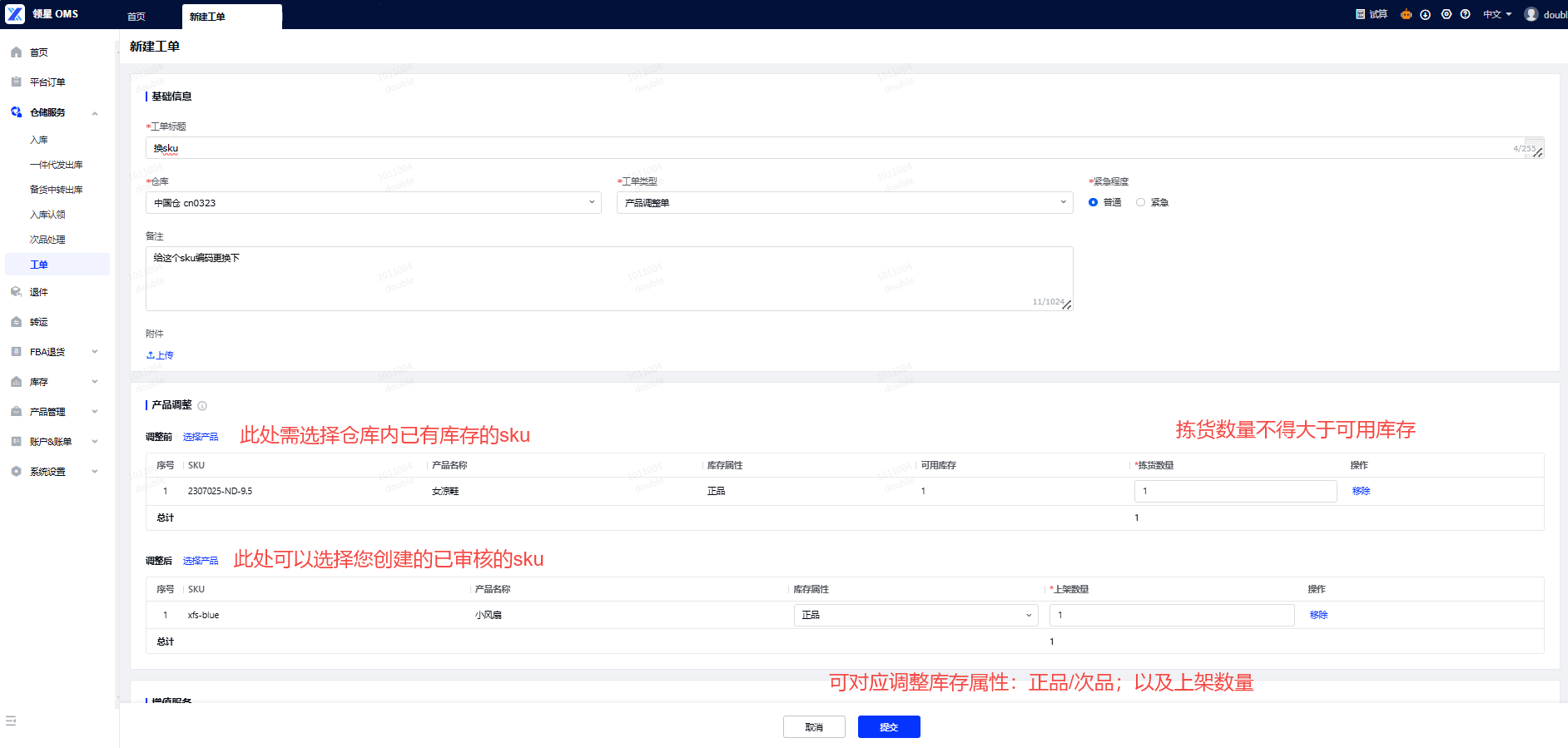 产品调整单:是您在需要修改产品相关信息时,需要提交的专项工单。比如您想改产品名称、更换产品SKU 、调整产品库存,都可以通过提交这份工单走流程处理,确保系统里的产品数据和您的实际需求保持一致。