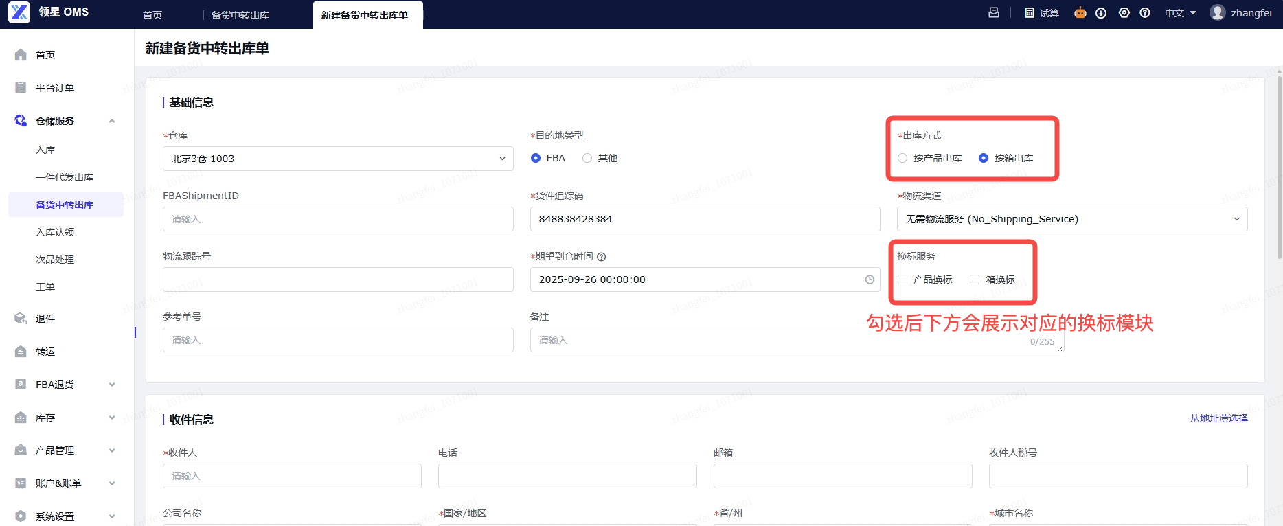 1. 卖家在OMS创建备货中转出库单,预报换标信息