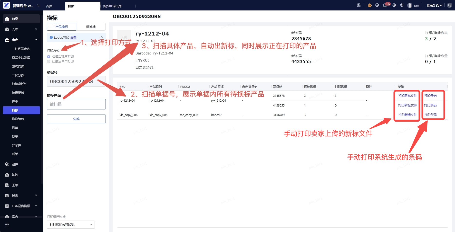 先扫单据号,定位到单据中需要换标的产品,再扫产品旧标自动打印新标,此时支持扫描产品 SKU、产品条码、FNSKU、预报换标信息时填写的自定义条码。