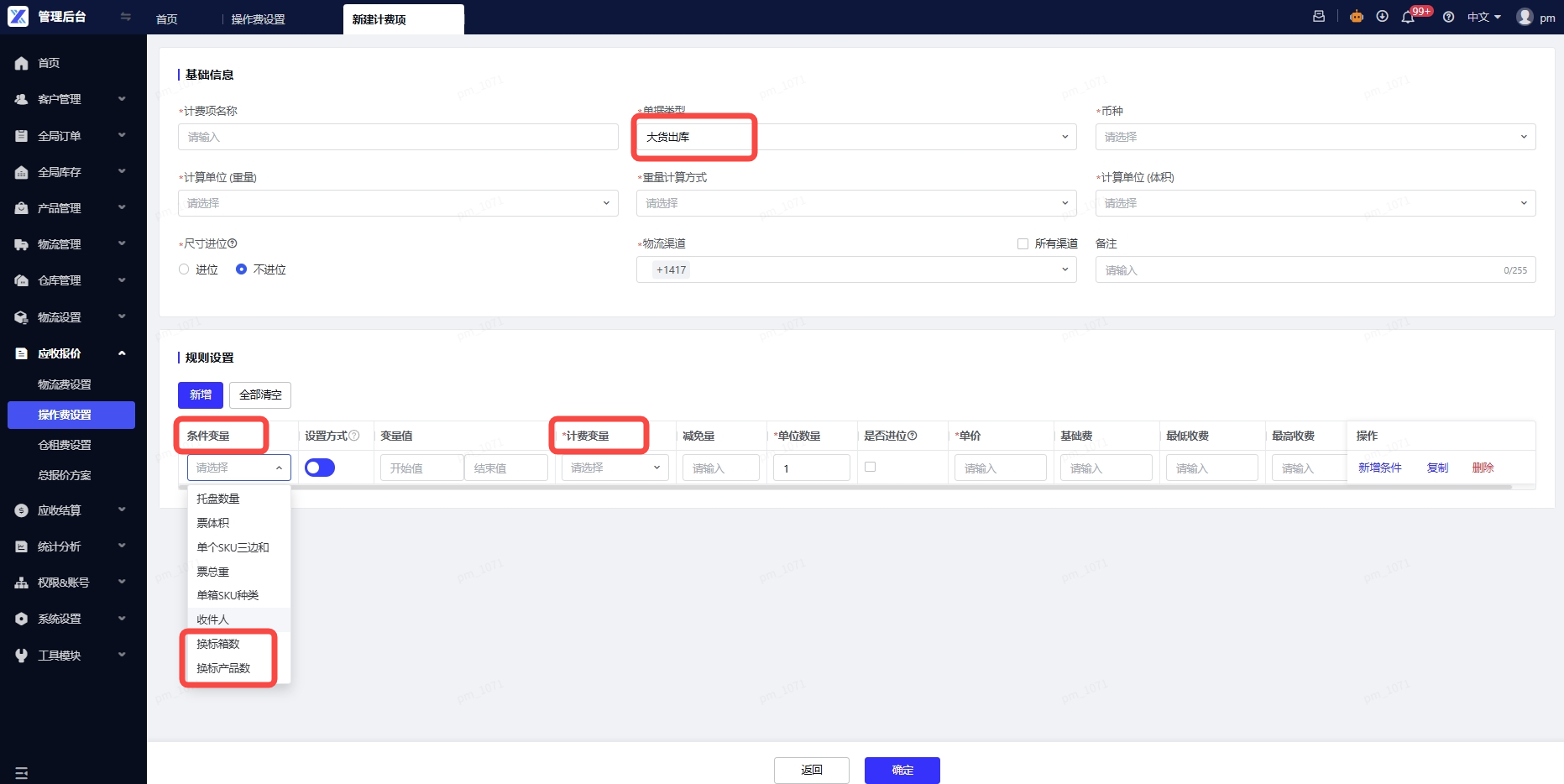 在管理后台设置大货出库单操作费,在条件变量和计费变量中分别新增【换标箱数】【换标产品数】。
