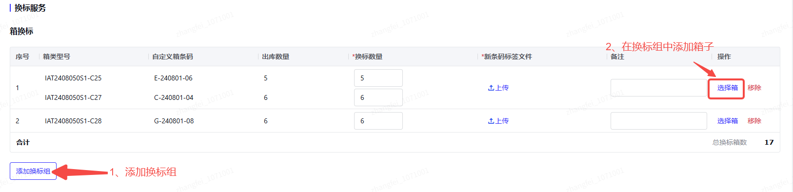 换箱标:在平台预报入库时,平台一般会给同一批预报的箱子返回一个pdf箱标文件,因此在换箱标时引入换标组概念,同一个换标组中支持添加多个系统箱子,对应一个换标文件。
