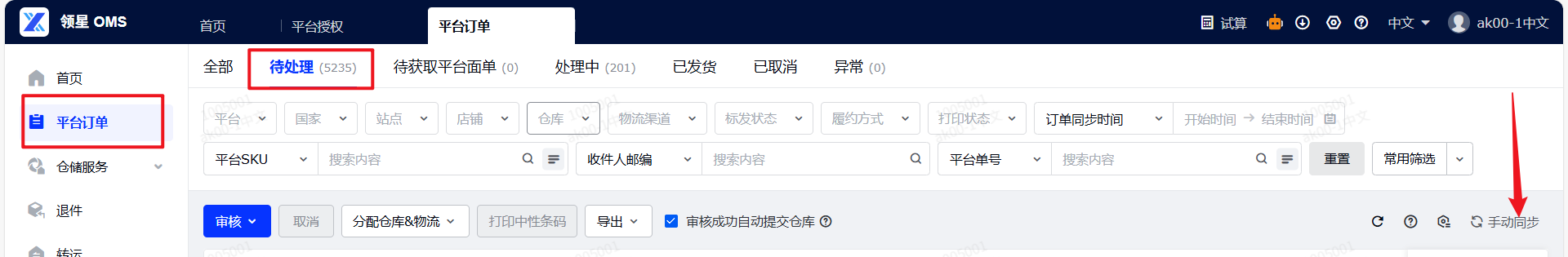 ● 待处理:OMS端同步已授权的电商平台店铺的订单会展示在待处理状态。