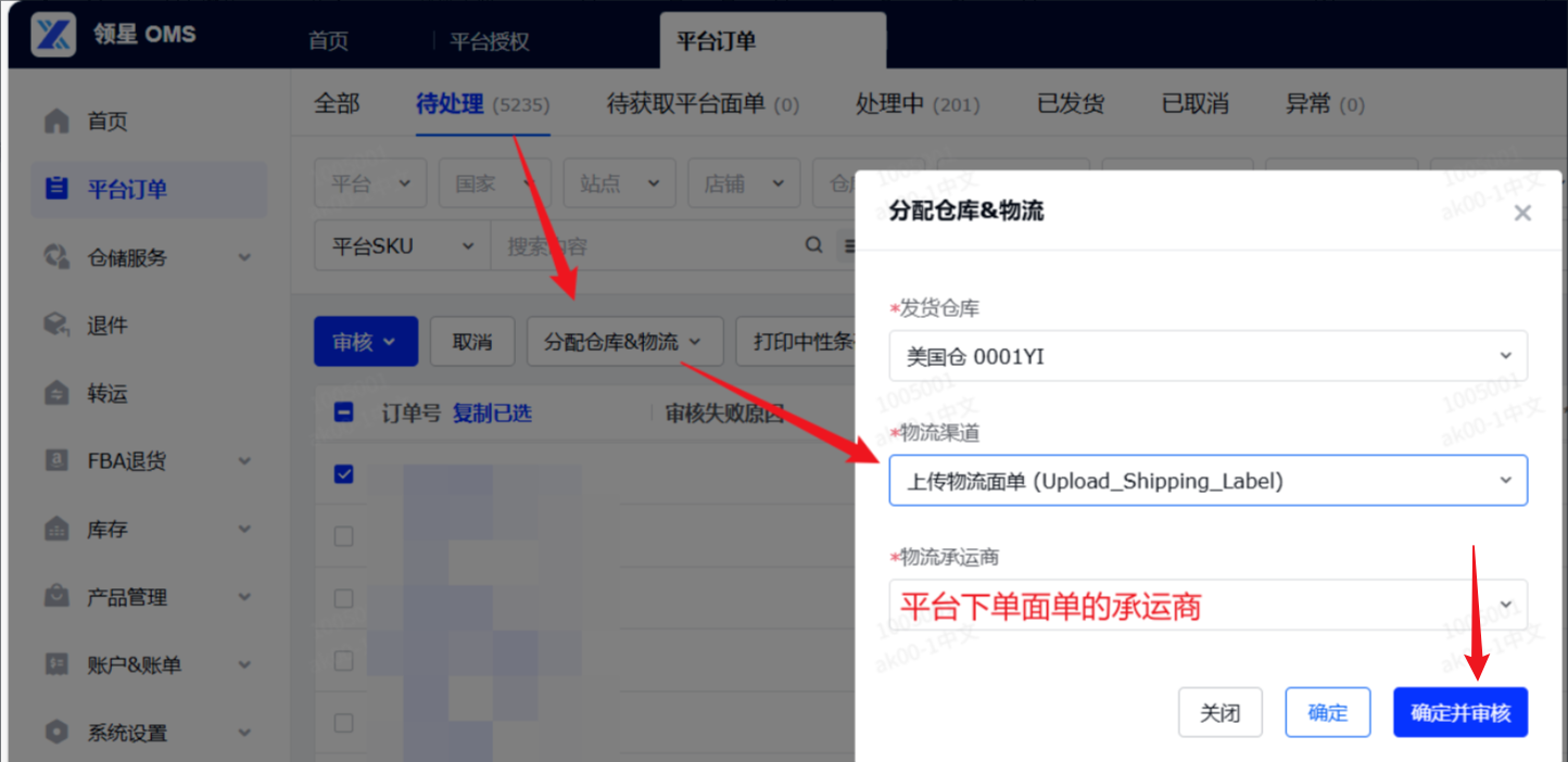 订单使用平台面单进行出库,在选择物流渠道时注意需要选择可以获取平台面单的渠道,选择后点击【确定并审核】。