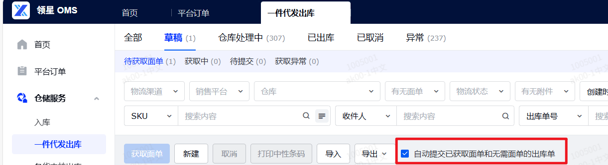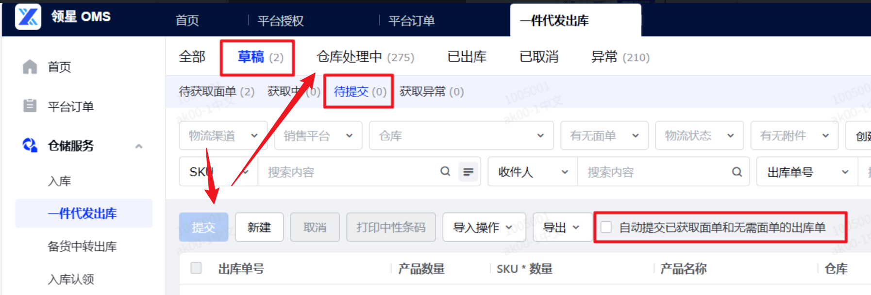 一件代发出库勾选【自动提交已获取面单和无需面单的出库单】,在【草稿-待提交】状态无需手动提交,订单获取面单后或不需要使用面单的出库单可以自动提交到【仓库处理中】。