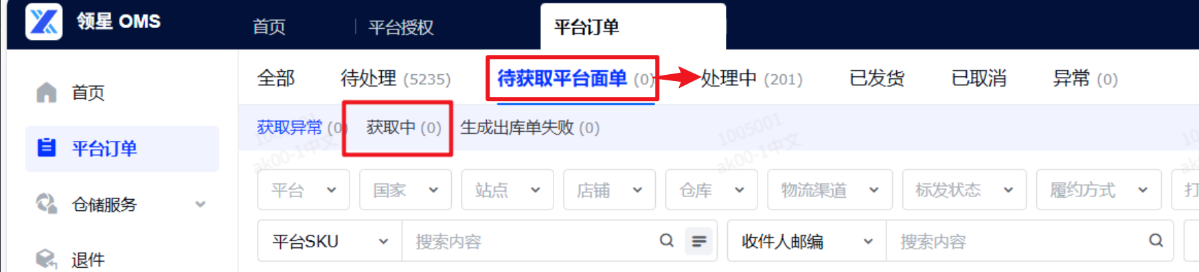 ● 待获取平台面单-获取中:平台订单使用平台面单出库的情况,在该状态下获取平台下单的面单。